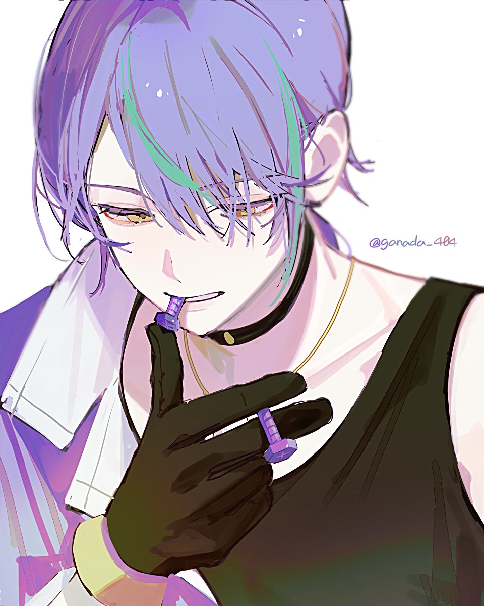1boy black_choker black_gloves black_tank_top choker clenched_teeth colored_eyelashes deeper_and_deeper_(project_sekai) ganada_404 gloves green_hair hand_up highres jewelry kamishiro_rui layered_clothes male_focus multicolored_hair necklace official_alternate_costume official_alternate_hairstyle project_sekai purple_hair screw simple_background solo streaked_hair tank_top teeth twitter_username two-tone_hair upper_body white_background