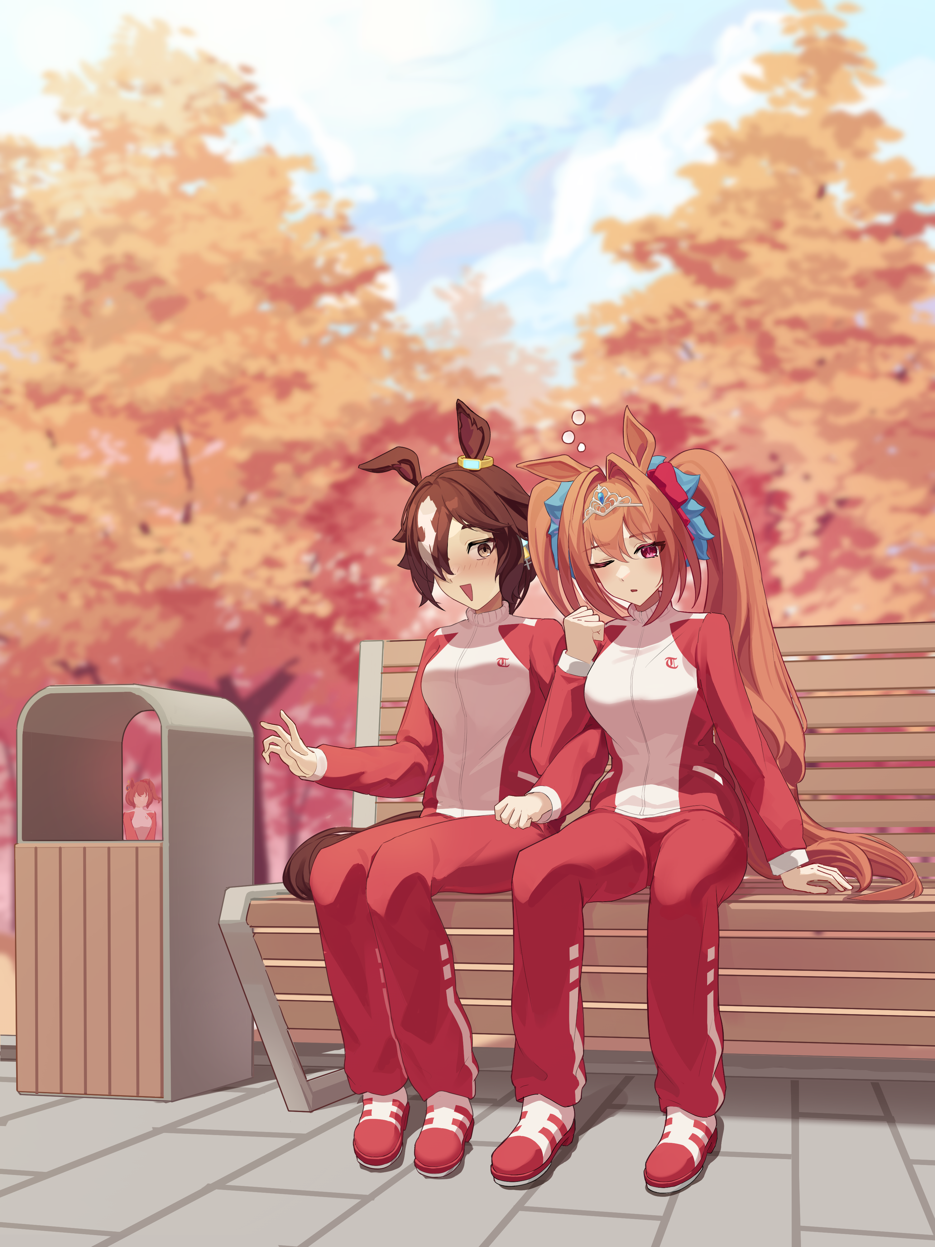3girls absurdres animal_ears aston_machan_(umamusume) bench blue_sky blurry blurry_background brown_eyes brown_hair cloud commentary_request daiwa_scarlet_(umamusume) day depth_of_field hair_intakes hair_over_one_eye highres horse_ears horse_girl horse_tail jacket kitsunezaki long_hair long_sleeves multicolored_hair multiple_girls on_bench outdoors pants park_bench puffy_long_sleeves puffy_sleeves red_eyes red_jacket red_pants shoes one_ear_down sitting sky tail tiara track_jacket track_pants track_suit tree two-tone_hair umamusume very_long_hair vodka_(umamusume) white_hair white_shoes