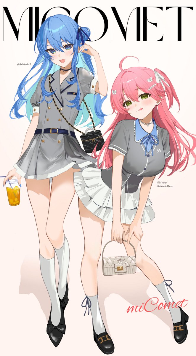 2girls :d :q ahoge bag black_shoes blue_eyes blue_hair blush breasts cup drinking_glass drinking_straw flat_chest green_eyes grey_shirt hair_bun hair_ribbon handbag highres hololive hoshimachi_suisei large_breasts layered_skirt long_hair looking_at_viewer multiple_girls neck_ribbon one_side_up open_mouth pink_hair ribbon sakura_miko sakurada_nana shirt shoes shoulder_bag skirt smile socks tongue tongue_out twitter_username virtual_youtuber white_skirt white_socks