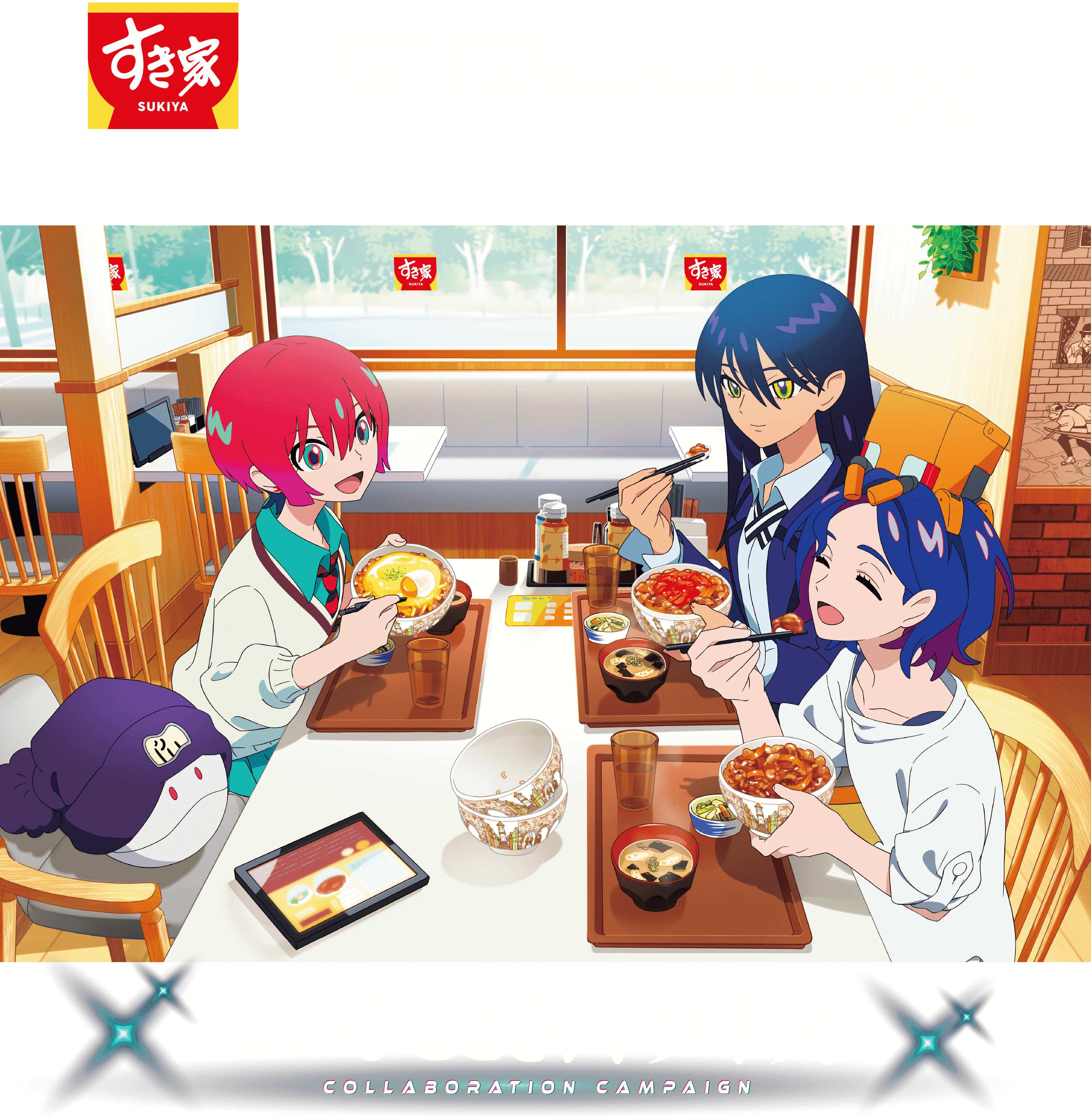 1boy 2girls absurdres amate_yuzuriha aqua_eyes beanie blue_hair bowl chair chopsticks closed_eyes collared_shirt colored_inner_hair conch_(gundam) cup food gundam gundam_gquuuuuux gyuudon haro hat highres holding holding_chopsticks indoors jacket long_hair long_sleeves multicolored_hair multiple_girls necktie non-humanoid_robot nyaan_(gundam_gquuuuuux) official_art on_chair open_mouth pom_pom_(clothes) pom_pom_beanie promotional_art purple_hair red_hair restaurant robot school_uniform shirt short_hair shuji_ito sitting skirt smile sukiya sweater table two-tone_hair yellow_eyes