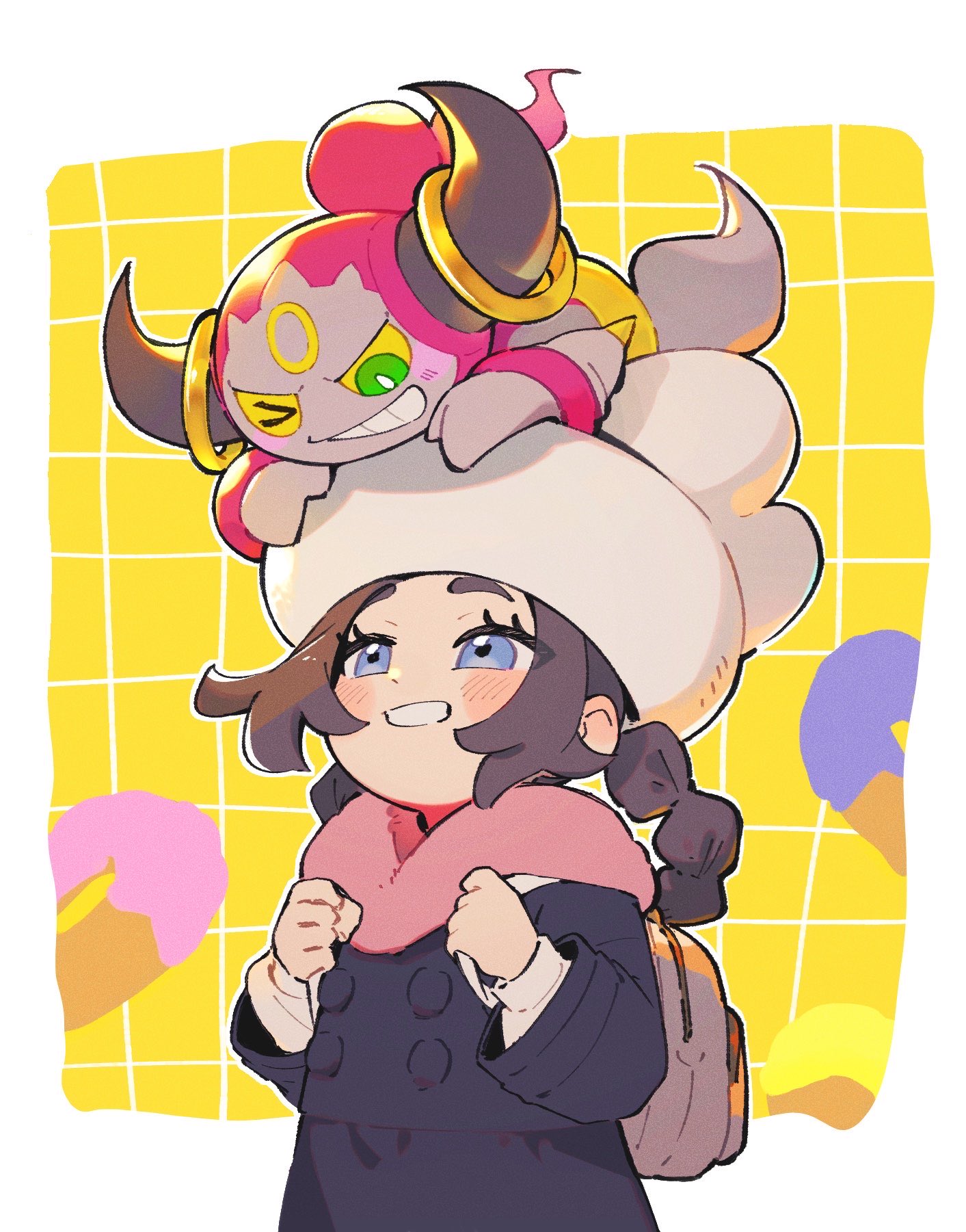 >_o 1girl ansha_(pokemon) bag black_coat black_hair blue_eyes blush coat colored_sclera gen_6_pokemon green_eyes grin hat highres hoopa hoopa_(confined) inari1369 legendary_pokemon long_hair long_sleeves mythical_pokemon nintendo on_head one_eye_closed open_mouth pink_scarf pokemon pokemon_(creature) pokemon_legends:_z-a pokemon_on_head scarf smile teeth white_bag white_hat winter_clothes winter_coat yellow_sclera