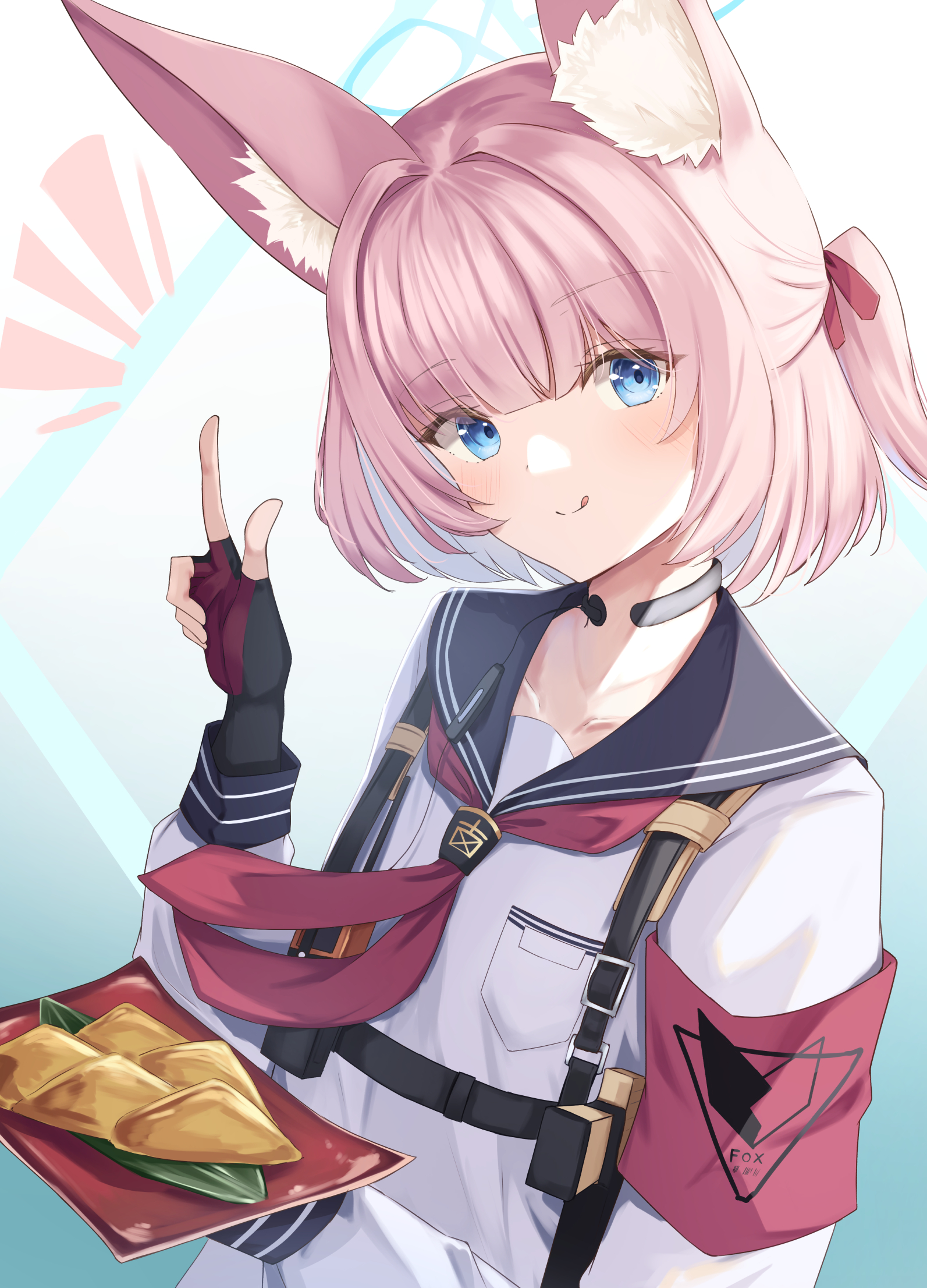 1girl :q aki_tsune animal_ear_fluff animal_ears armband black_gloves black_sailor_collar blue_archive blue_background blue_eyes blue_halo blunt_bangs blush closed_mouth collarbone commentary_request eyelashes eyes_visible_through_hair fingerless_gloves food fox_ears fox_girl gloves gradient_background hair_intakes hair_ribbon half_updo halo hands_up highres holding holding_plate inarizushi index_finger_raised indoors long_sleeves looking_at_viewer medium_hair neckerchief niko_(blue_archive) notice_lines partial_commentary plate ponytail red_armband red_gloves red_neckerchief red_ribbon ribbon sailor_collar school_uniform serafuku shirt short_ponytail sidelighting simple_background smile solo split_mouth straight_hair sushi tactical_school_uniform tongue tongue_out two-sided_gloves white_background white_shirt