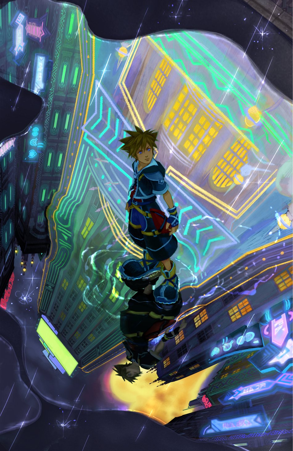 1boy blue_eyes brown_hair commentary english_commentary fingerless_gloves gloves highres hood hood_down hooded_jacket jacket kingdom_hearts kingdom_hearts_ii looking_up male_focus mimamilux neon_lights outdoors puddle rain reflection reflective_liquid shoes short_hair short_sleeves shorts solo sora_(kingdom_hearts) spiked_hair standing water