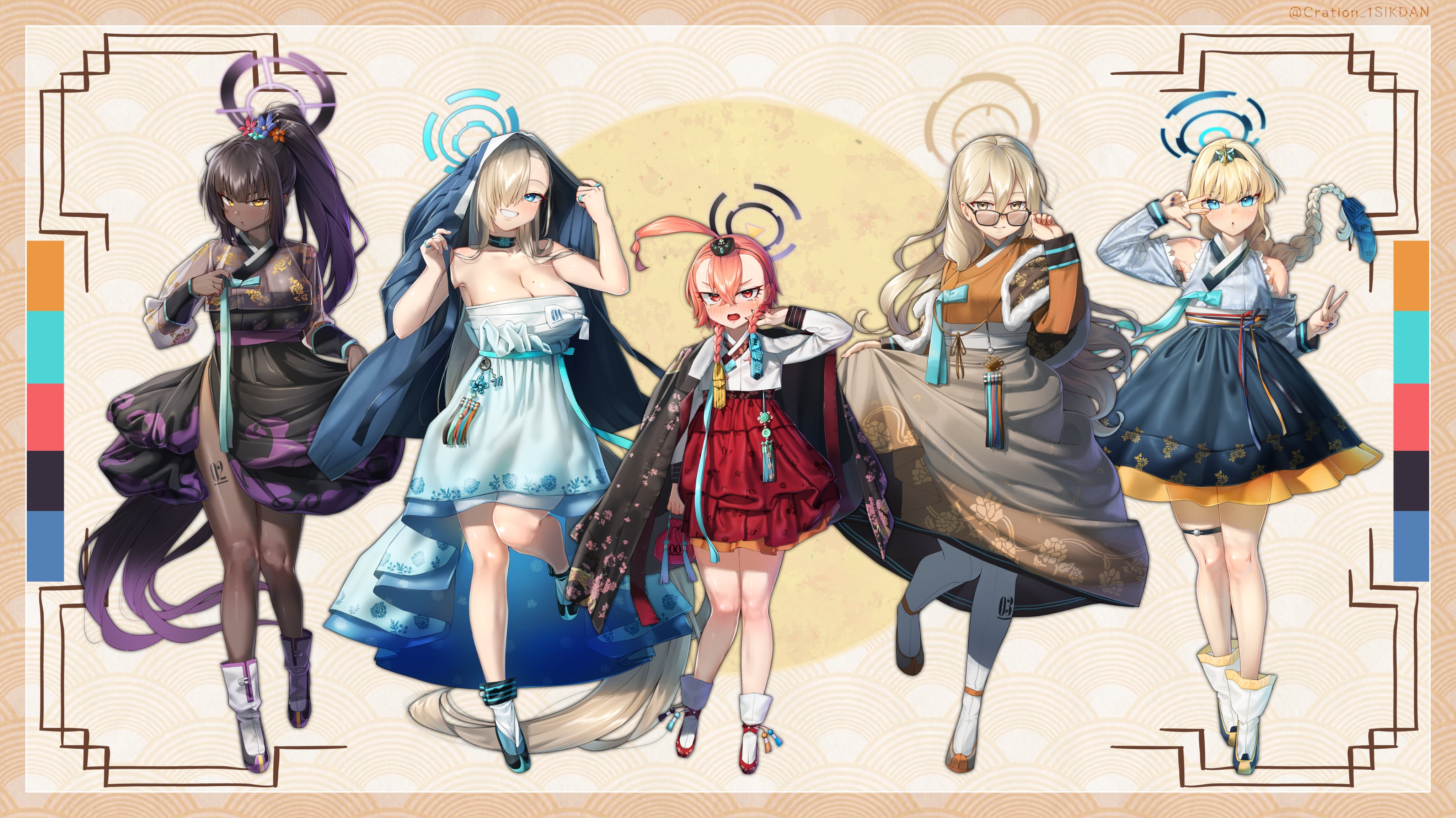5girls absurdres adjusting_eyewear akane_(blue_archive) alternate_costume alternate_hairstyle armpits asuna_(blue_archive) bare_legs bare_shoulders black-framed_eyewear black_hair black_shoes black_skirt blonde_hair blue_archive blue_dress blue_eyes blue_halo blue_nails blue_shoes blush braid breasts brown_cape brown_skirt cape choker cleaning_&_clearing_(blue_archive) cleavage collarbone commentary dark-skinned_female dark_skin detached_sleeves double_v dress full_body fur_trim glasses gradient_hair grey_shoes grin hair_between_eyes hair_over_one_eye halo hanbok highres holding_own_skirt karin_(blue_archive) korean_clothes large_breasts leg_tattoo long_braid long_hair looking_at_viewer medium_dress mole mole_on_breast multicolored_hair multiple_girls neru_(blue_archive) number_tattoo orange_hair orange_hanbok pantyhose parted_lips ponytail purple_hair red_eyes sash see-through_clothes see-through_shirt shirt shoes short_hair skirt small_breasts smile socks tattoo thighs toki_(blue_archive) untranslatable_commentary v very_long_hair walking_nakta white_hanbok white_pantyhose white_sash white_socks yellow_halo