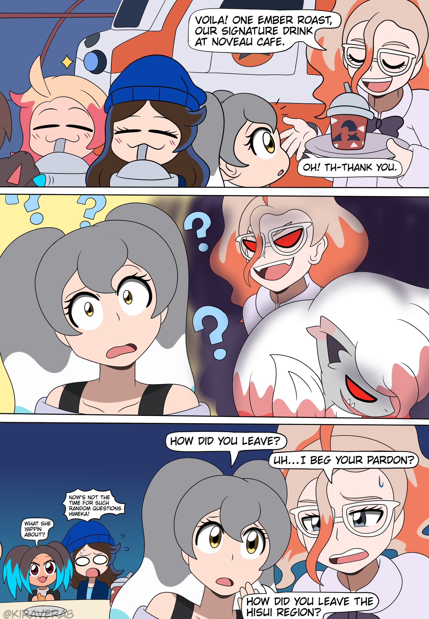 1boy 4girls ? ahoge apron black_bow blonde_hair blue_eyes bow bowtie brown_hair claws closed_eyes commentary cup disposable_cup english_commentary food_truck glasses gradient_hair grey_fur griselle_(pokemon) hair_pulled_back hat highres hisuian_zoroark jacket kiravera8 multicolored_hair multiple_girls nintendo orange_hair outdoors pokemon pokemon_(creature) pokemon_legends:_z-a red_apron red_eyes red_hair two-tone_hair urbain_(pokemon) white-framed_eyewear white_fur white_hair yellow_eyes