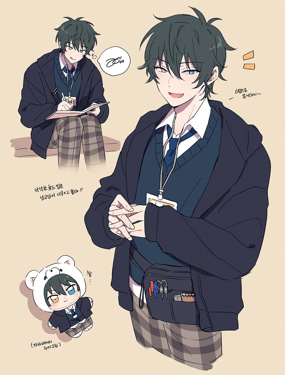 1boy bear black_bag black_jacket blue_eyes blue_necktie blue_sweater brown_background character_doll character_signature closed_mouth collared_shirt commentary_request doll ensemble_stars! fingernails green_hair hair_between_eyes heterochromia highres holding holding_notebook holding_pen hood hood_down hooded_jacket interlocked_fingers jacket kagehira_mika korean_commentary layered_clothes long_sleeves male_focus multiple_views necktie notebook notice_lines open_clothes open_jacket open_mouth pants pen plaid_clothes plaid_pants round_o0 shirt simple_background smile speech_bubble sweater thought_bubble tongue tongue_out writing yellow_eyes