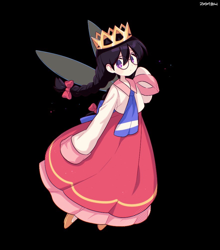 1girl artist_name bad_id bad_twitter_id black_background bow crown fairy fairy_wings glasses hair_bow kirby_(series) kirby_64 long_skirt nintendo oxo_xwo pink_skirt red_bow ripple_star_queen simple_background skirt sleeves_past_fingers sleeves_past_wrists wings