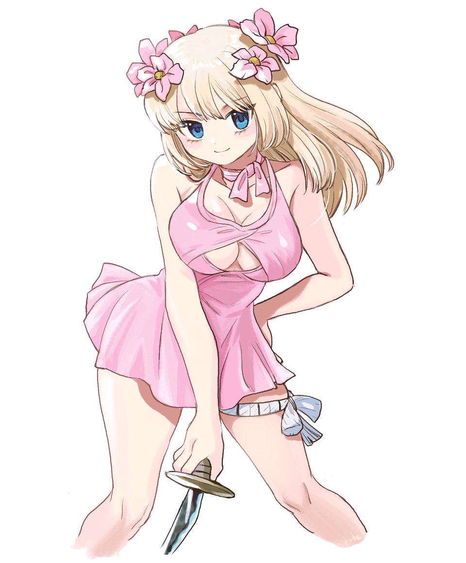 1girl blonde_hair blue_eyes breasts choker cleavage cropped_legs dagger dr._stone dress flower hair_flower hair_ornament hand_on_own_hip holding holding_knife holding_weapon knife kohaku_(dr._stone) large_breasts leaning_forward long_hair looking_at_viewer pink_choker pink_dress ribbon_choker sexesuki smile solo thigh_strap weapon white_background