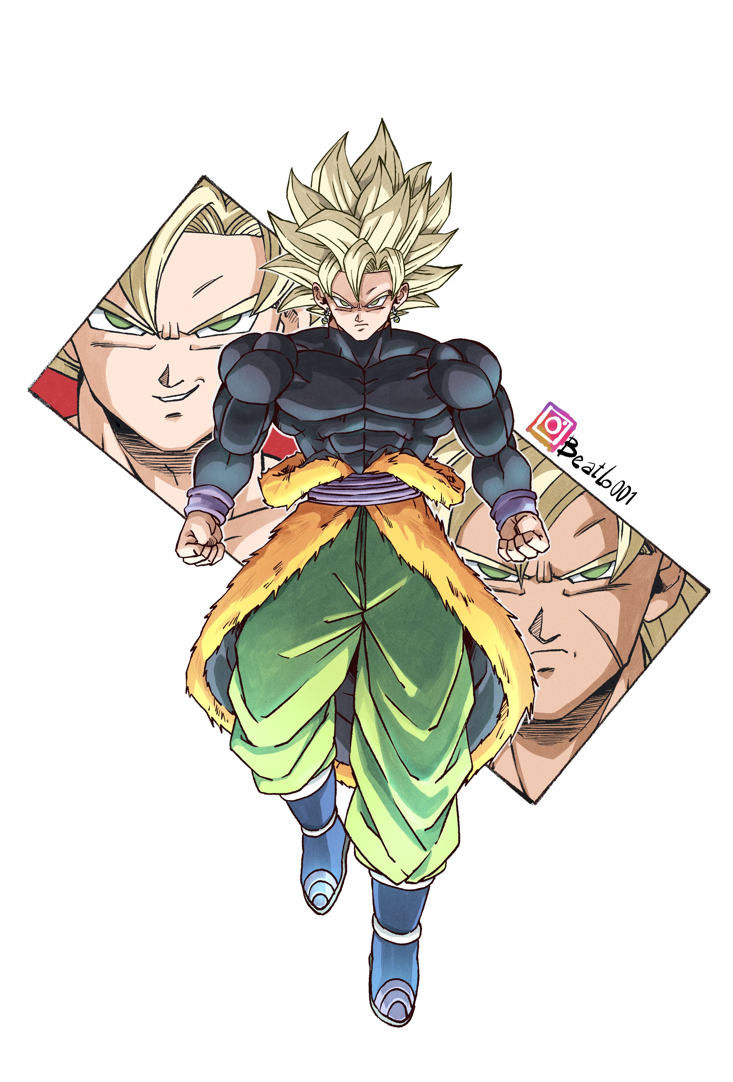 3boys absurdres beatlo_(rodrigo38658978) blonde_hair broly_(dragon_ball_super) dragon_ball dragon_ball_super dragon_ball_super_broly earrings full_body fusion green_pants highres jewelry medium_hair multiple_boys muscular muscular_male pants potara_earrings simple_background solo_focus son_goku spiked_hair super_saiyan super_saiyan_1 white_background
