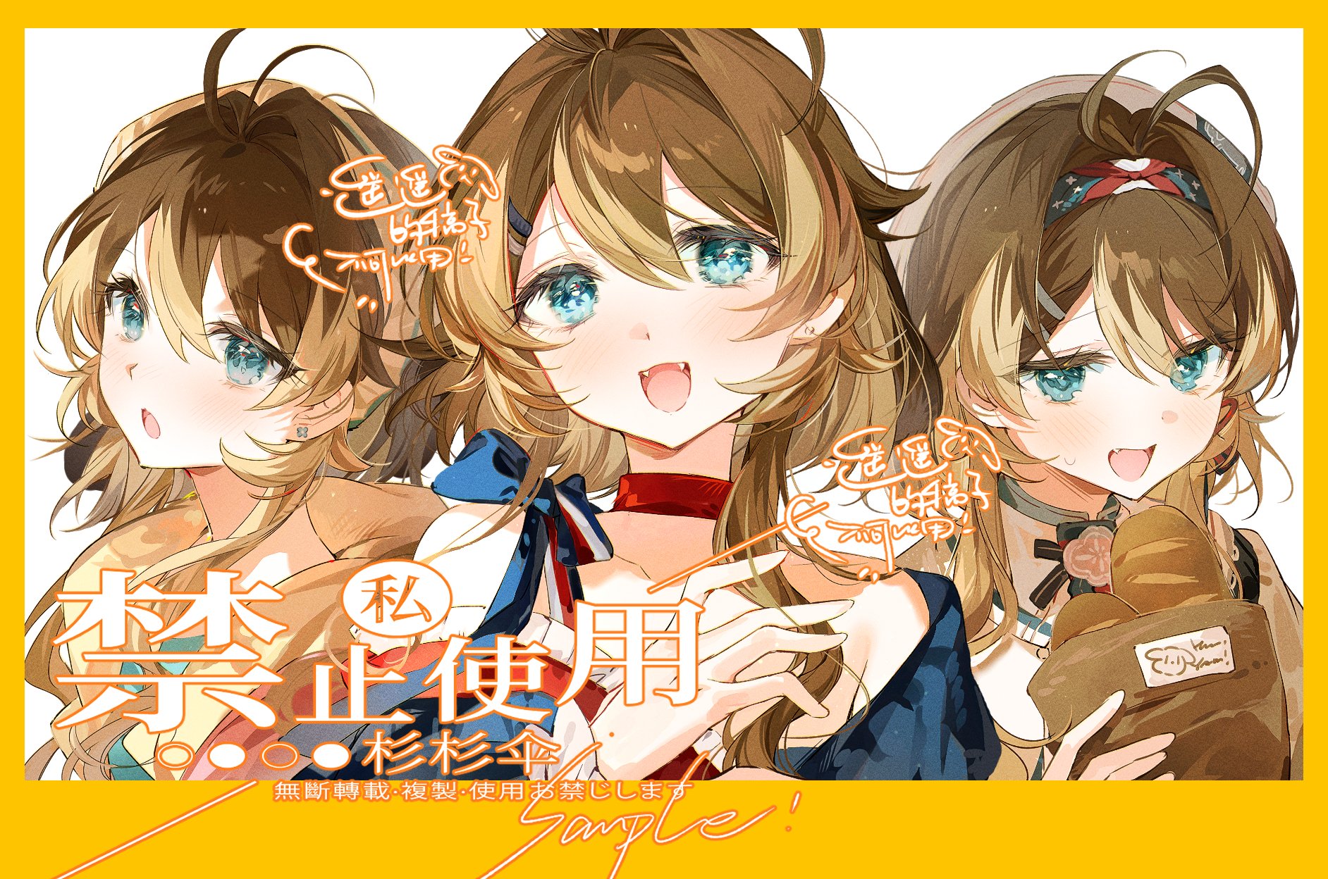 1girl 3girls bag baguette bare_shoulders blonde_hair blue_eyes bread brown_hair chinese_text choker food hair_between_eyes hands_up highres kamu_(poulro) long_hair looking_at_viewer multicolored_hair multiple_girls multiple_views open_mouth original paper_bag smile upper_body watermark