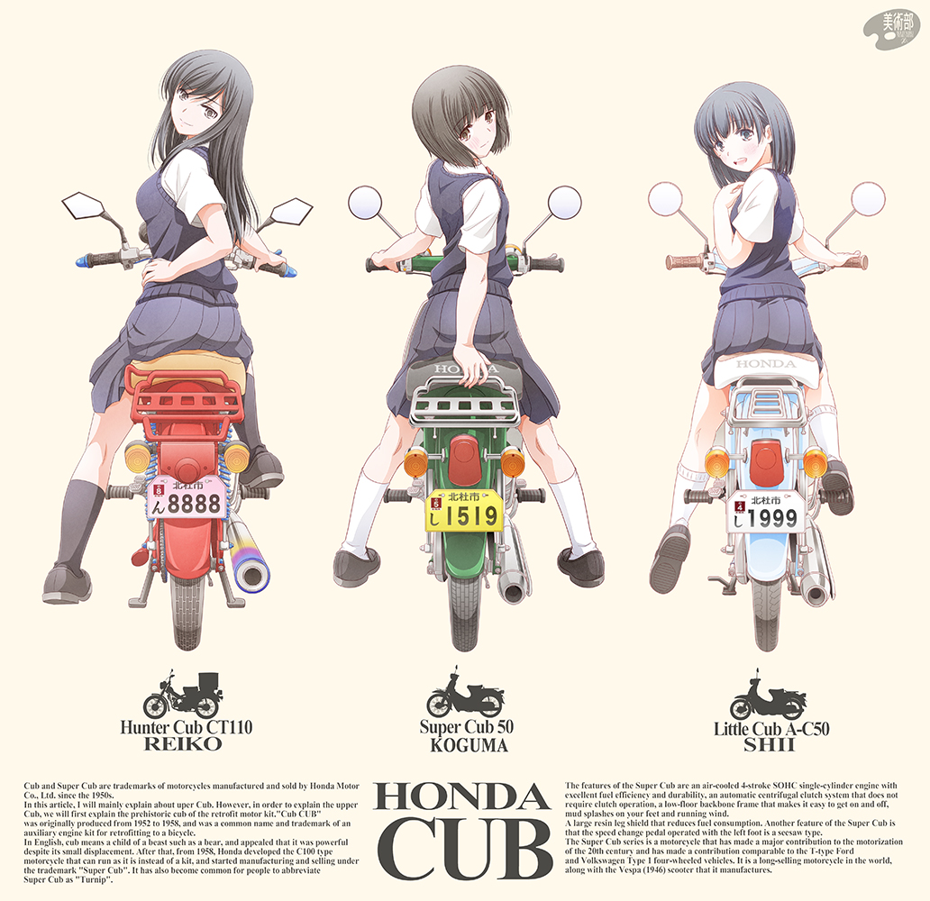ass black_hair black_socks blush breasts character_request embarrassed koguma_(super_cub) long_hair looking_back medium_breasts motor_vehicle motorcycle on_motorcycle reiko_(super_cub) school_uniform shizuki_michiru short_hair skirt small_breasts socks super_cub white_socks