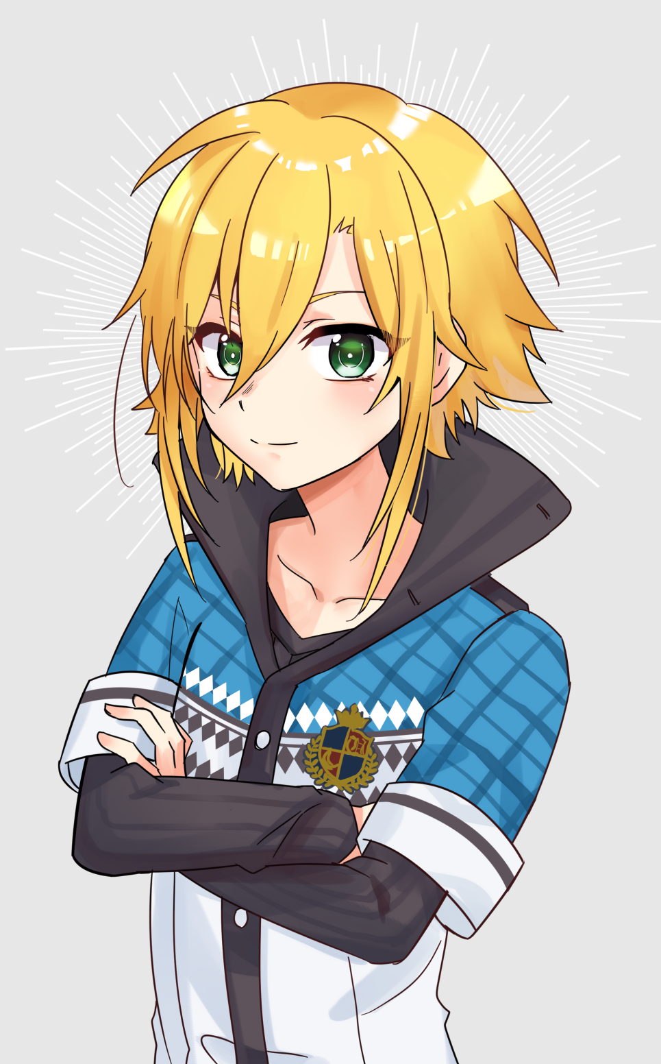 1boy blonde_hair blue_jacket blush buttons closed_mouth collarbone collared_jacket crossed_arms flipped_hair green_eyes grey_background grey_shirt hair_between_eyes highres jacket layered_sleeves long_sleeves looking_at_viewer male_focus nijisanji plaid_clothes plaid_jacket ribbed_shirt sakurakyousuke0 shirt short_hair short_over_long_sleeves short_sleeves sidelocks solo standing upper_body uzuki_kou uzuki_kou_(1st_costume) v-neck virtual_youtuber white_jacket