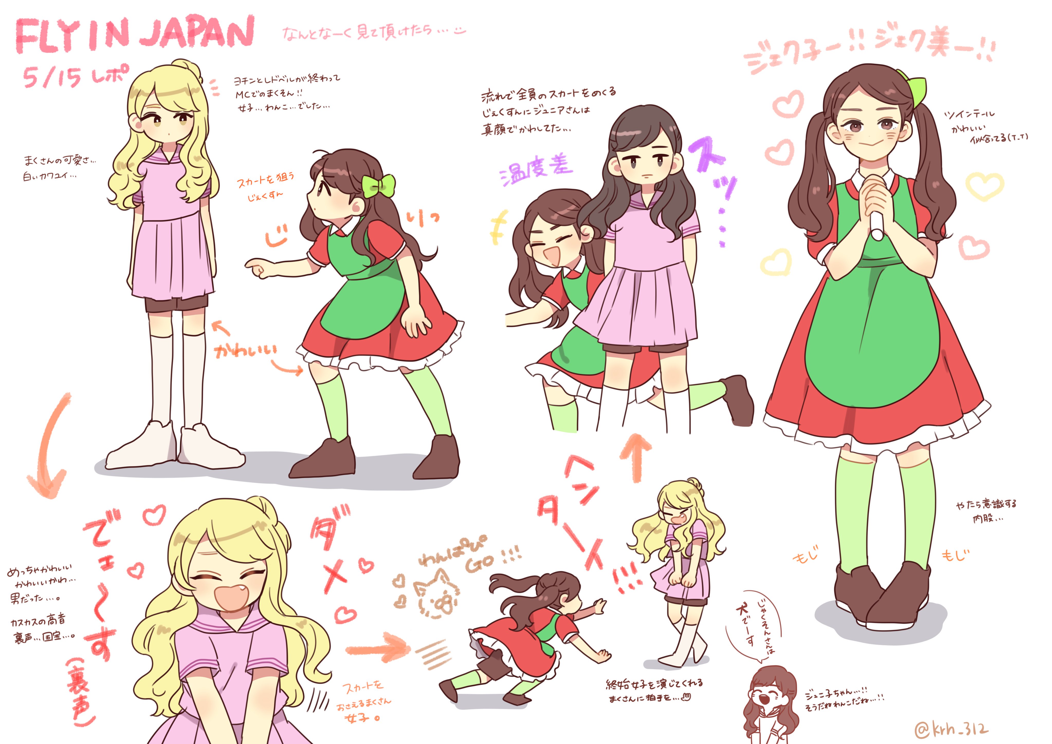 +++ 3boys ^_^ absurdres apron blonde_hair brown_hair closed_eyes commentary_request crossdressing crossdressing_(mtf) dress full_body gfriend got7 green_apron green_socks heart highres holding holding_microphone jackson_wang_(got7) jinyoung_(got7) k-pop karuha_(beete) mark_tuan microphone multiple_boys pink_dress red_dress red_velvet_(group) short_sleeves shorts simple_background smile socks twintails twitter_username white_socks