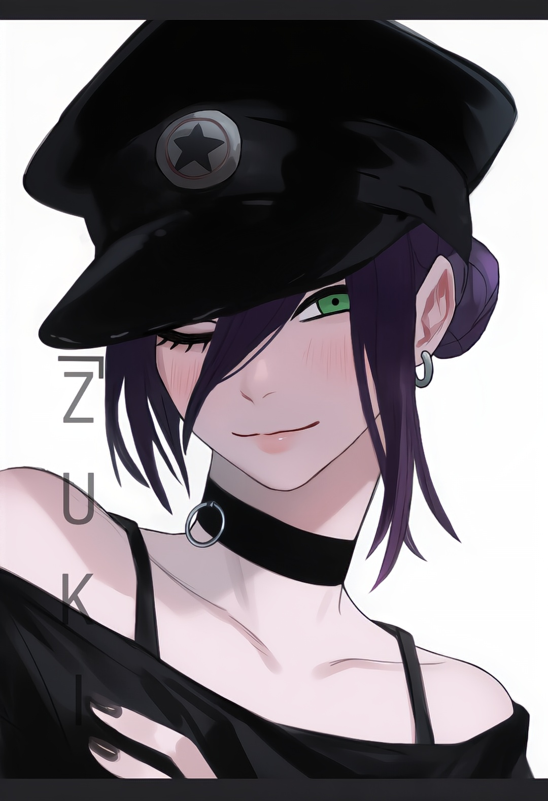 1girl artist_name black_choker black_hat black_nails chainsaw_man choker earrings green_eyes grenade_pin hair_between_eyes hair_bun hat highres jewelry looking_at_viewer one_eye_closed peaked_cap purple_hair reze_(chainsaw_man) simple_background solo white_background zuki_(jazs4353)