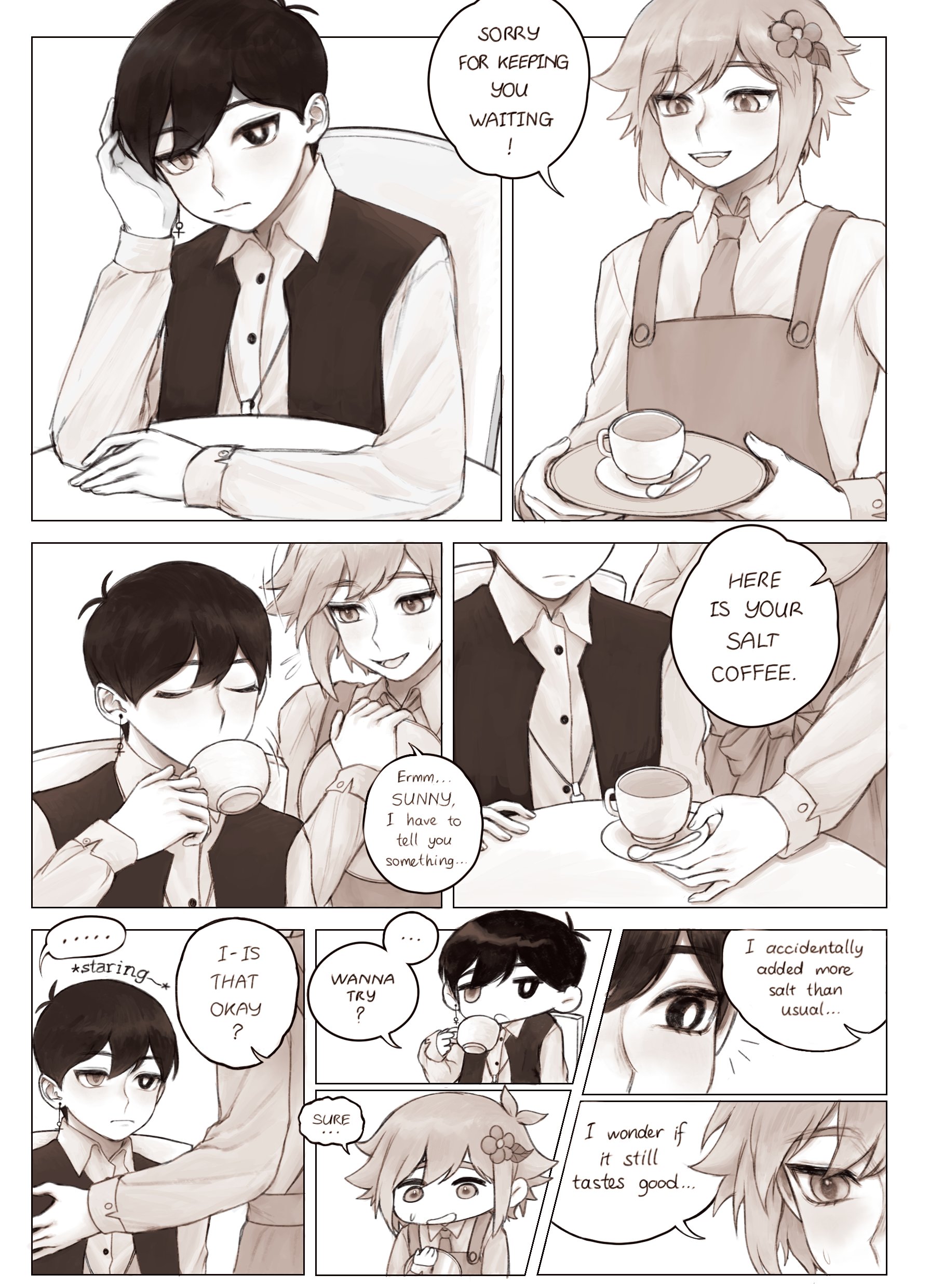 ... 2boys absurdres alternate_costume antenna_hair apron basil_(faraway)_(omori) basil_(omori) closed_mouth collared_shirt cup double-parted_bangs earrings english_text flower flying_sweatdrops greyscale hair_between_eyes hair_flower hair_ornament heterochromia highres holding holding_cup holding_plate jewelry k0kum0tsu long_sleeves male_focus monochrome multiple_boys necklace necktie omori open_mouth plate right-to-left_comic shirt short_hair sidelocks single_earring smile speech_bubble spoilers spoken_ellipsis sunny_(omori) sweatdrop teeth upper_teeth_only vest yaoi