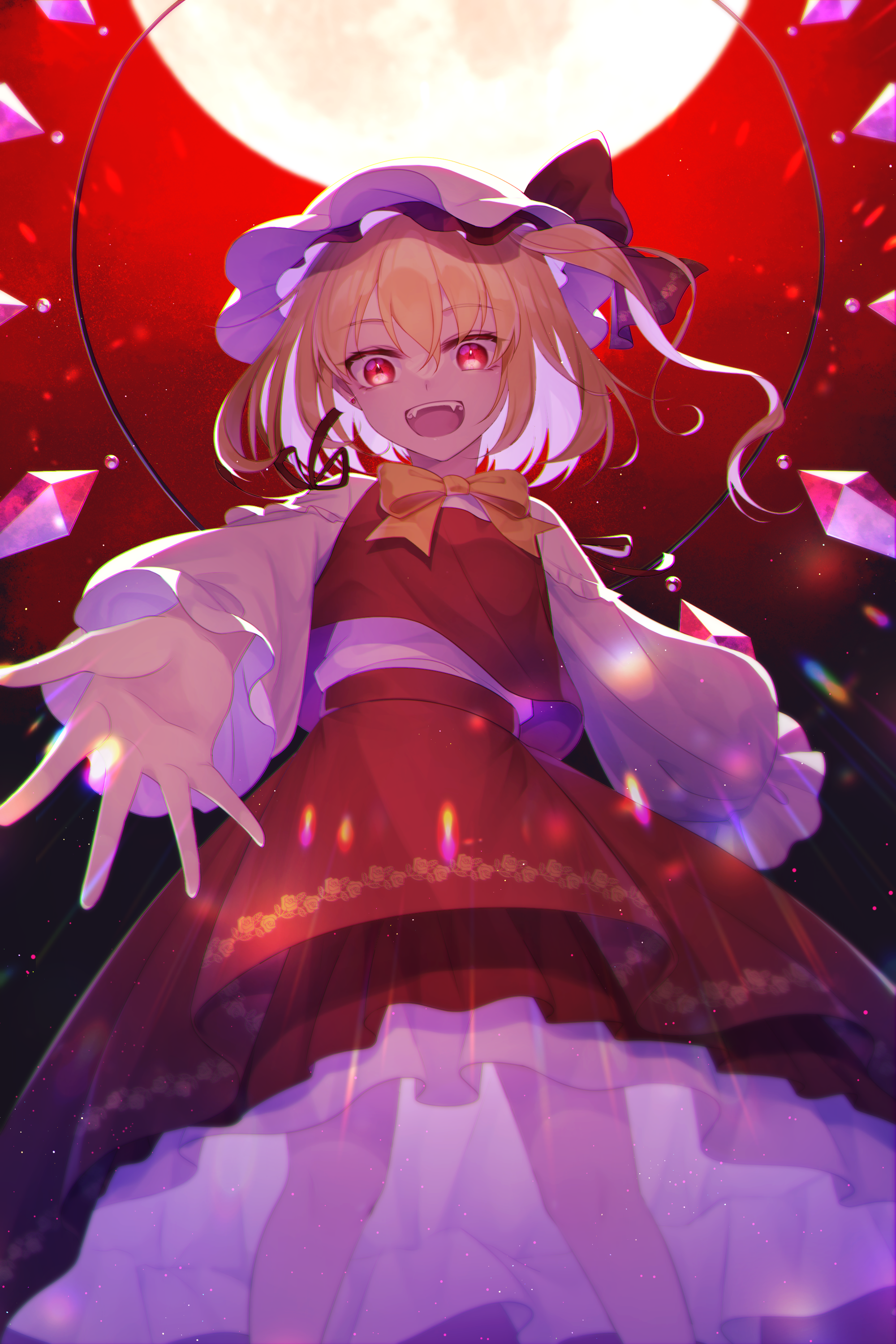 1girl :d absurdres blonde_hair bow bowtie commentary_request crystal_wings fangs feet_out_of_frame flandre_scarlet floral_print floral_print_skirt full_moon hat hat_bow highres knees lens_flare long_sleeves looking_at_viewer looking_down medium_hair mob_cap moon open_mouth outstretched_hand petticoat print_skirt puffy_long_sleeves puffy_sleeves reaching reaching_towards_viewer red_background red_bow red_eyes red_moon red_skirt red_vest shinketsu_kanyu shirt side_ponytail skirt smile solo teeth touhou upper_teeth_only vest white_hat white_shirt wings yellow_bow yellow_bowtie