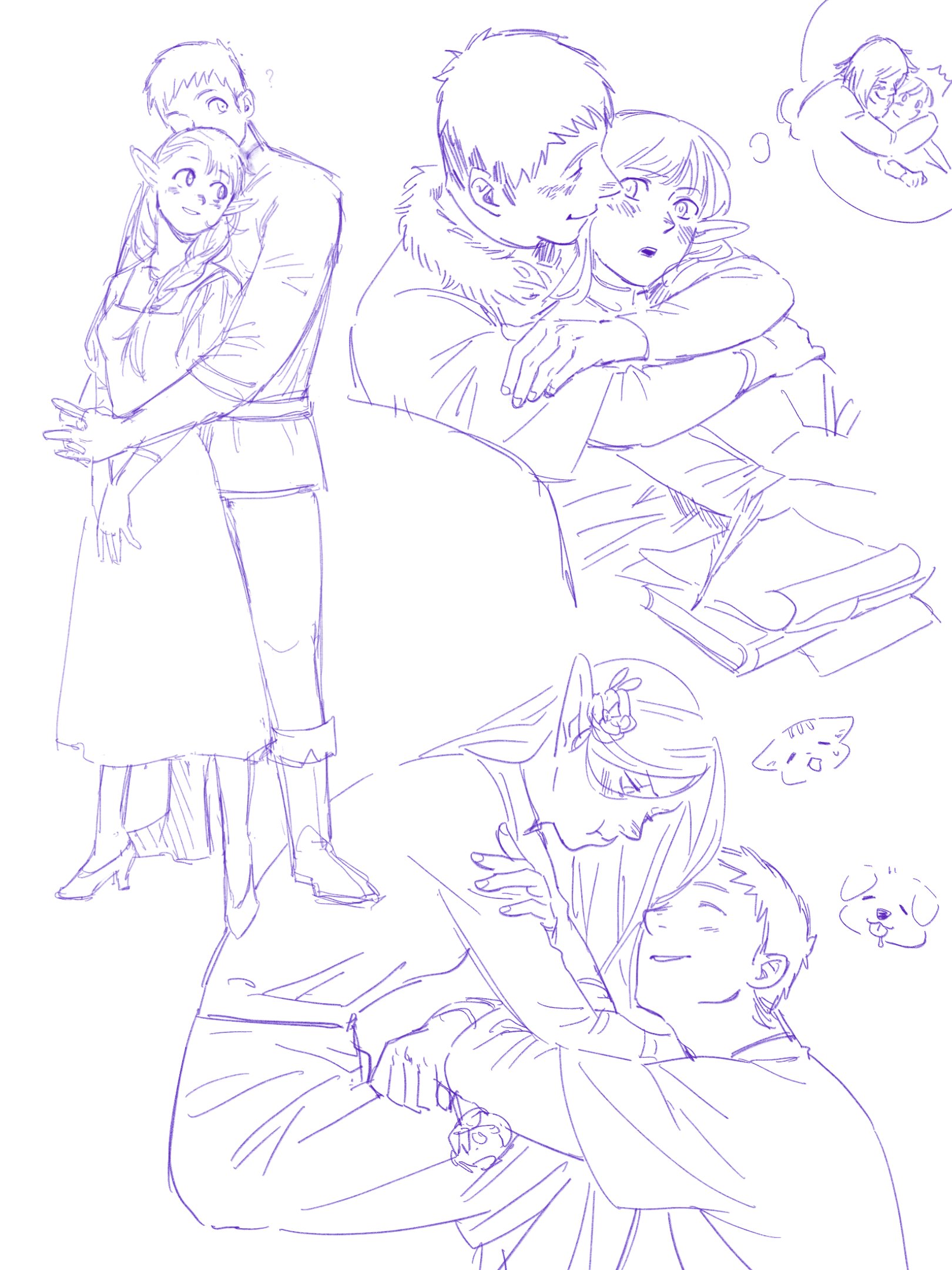 1boy 2girls :o ? ^_^ boots chinese_commentary closed_eyes commentary_request dog dress dungeon_meshi elf falin_touden flower hair_flower hair_ornament hair_over_another's_face high_heels highres hug hug_from_behind laios_touden light_blush long_hair marcille_donato medium_hair multiple_girls pointy_ears pout shirt short_hair sitting sketch smile speech_bubble thought_bubble white_background y95438370