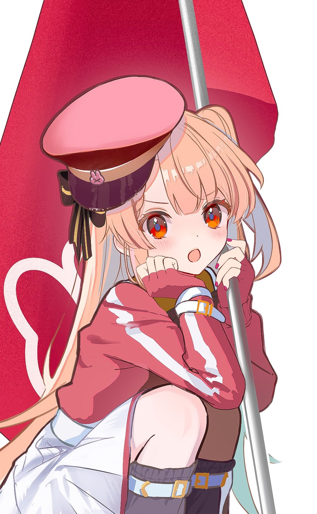 1girl :o belt black_bow black_socks blush bow feet_out_of_frame flag grey_socks hands_up hat highres holding holding_flag jacket kneehighs long_hair long_sleeves looking_at_viewer loose_socks nail_polish natori_sana official_alternate_costume one_side_up open_mouth peaked_cap pink_hat pink_nails pleated_skirt puffy_long_sleeves puffy_sleeves red_eyes red_hat red_jacket sana_channel shirt shuuha_arutsu simple_background skirt sleeves_past_wrists socks solo squatting tilted_headwear v-shaped_eyebrows very_long_hair white_background white_belt white_skirt