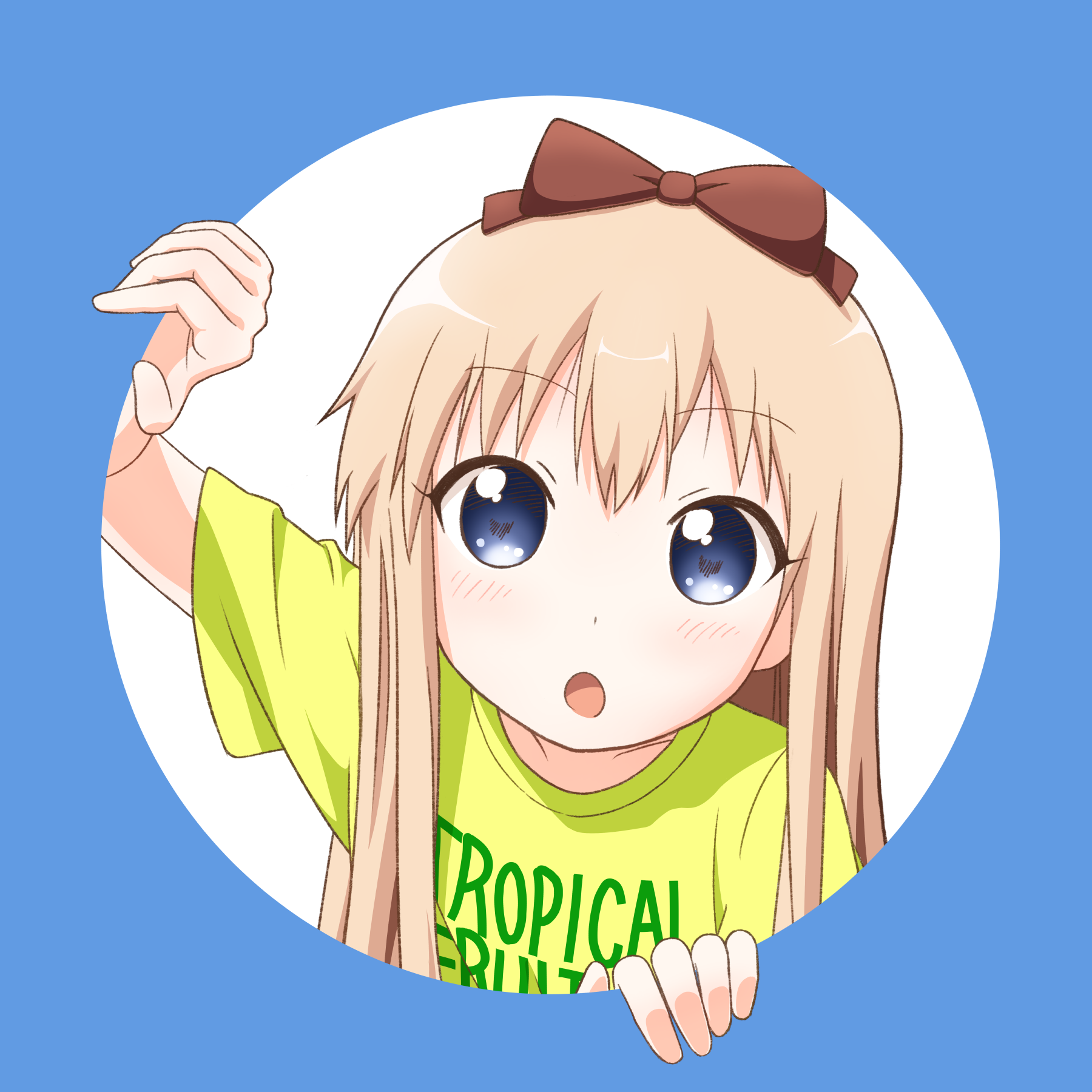 1girl :o blonde_hair blue_border blue_eyes border bow brown_bow child commentary_request fourth_wall hair_bow hands_up highres looking_at_viewer open_mouth outside_border potoio shirt solo t-shirt toshinou_kyouko yellow_shirt yuruyuri