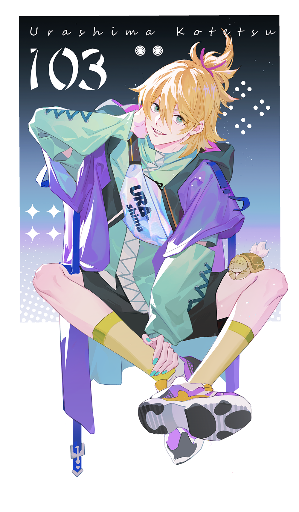 1boy arm_behind_head blonde_hair blue_eyes border character_name crossed_ankles fanny_pack hair_between_eyes highres looking_at_viewer male_focus ncww_rinichi open_mouth ponytail purple_ribbon ribbon sitting socks solo touken_ranbu turtle urashima_kotetsu white_border yellow_socks