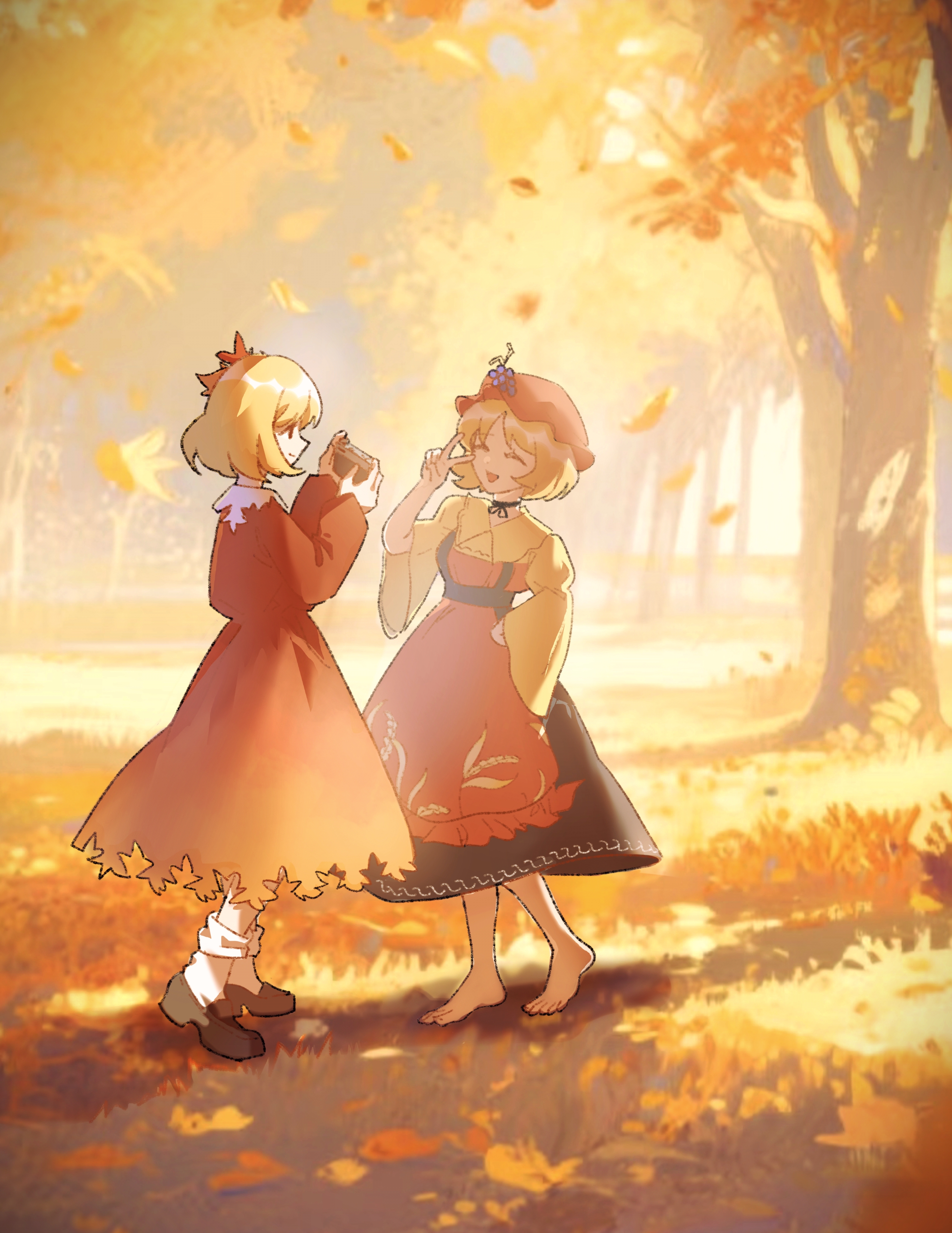 2girls absurdres aki_minoriko aki_shizuha apron barefoot blonde_hair camera closed_eyes dress forest grape_hat_ornament hat highres holding holding_camera leaf maple_leaf multiple_girls nature outdoors red_apron red_dress red_hat shirt short_hair smile taking_picture touhou v wide_sleeves xinbuqing yellow_shirt
