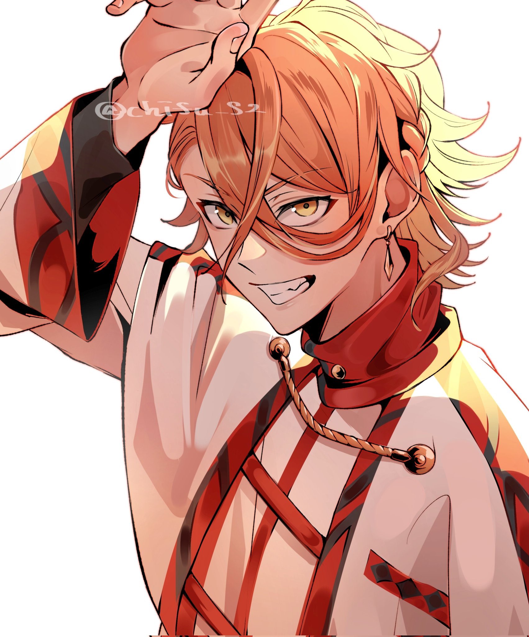 1boy capelet chifu_s2 commentary_request corrupted_twitter_file crossed_bangs earrings fire_emblem fire_emblem_engage hair_between_eyes highres jewelry long_sleeves male_focus nintendo open_mouth orange_hair pandreo_(fire_emblem) second-party_source short_hair smile solo teeth twitter_username upper_body white_background white_capelet yellow_eyes