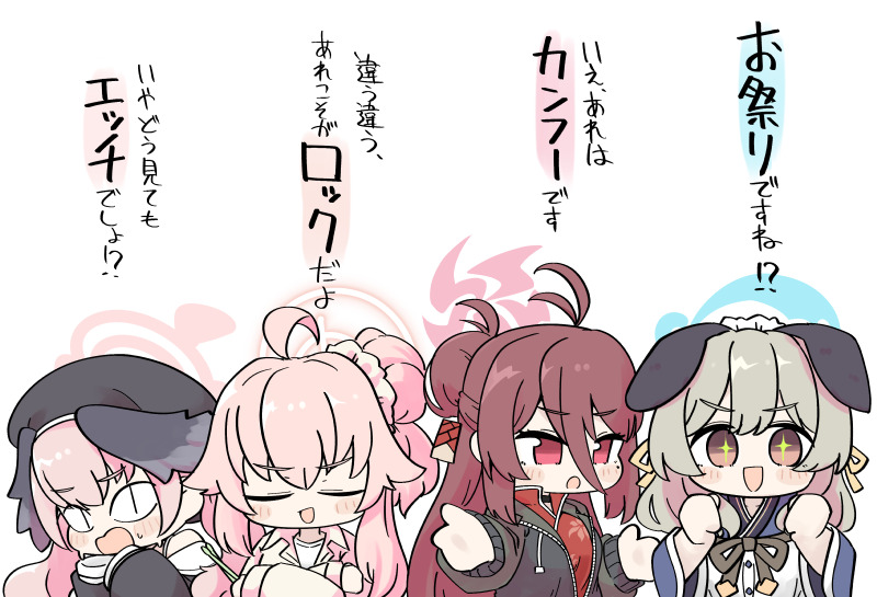 +_+ 4girls :d :o beret black_hat black_shirt black_wings blue_archive blue_kimono blush_stickers breasts brown_eyes brown_hair chibi china_dress chinese_clothes clenched_hands closed_eyes dress drumsticks grey_jacket hair_between_eyes hair_bun halo hat head_wings jacket japanese_clothes kimono koharu_(blue_archive) large_breasts long_sleeves low_twintails miranofuudoria multiple_girls natsu_(band)_(blue_archive) natsu_(blue_archive) open_clothes open_jacket open_mouth pink_hair pink_jacket puffy_long_sleeves puffy_sleeves red_dress red_eyes red_hair reijo_(blue_archive) shirt side_ponytail simple_background single_side_bun sleeves_past_fingers sleeves_past_wrists smile translation_request twintails umika_(blue_archive) white_background white_shirt wide_sleeves wings