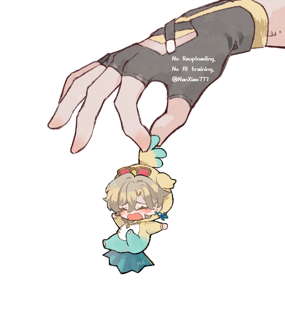 2boys aventurine_(honkai:_star_rail) aventurine_(origami_bird)_(honkai:_star_rail) bird_costume black_gloves blonde_hair blush caelus_(honkai:_star_rail) closed_eyes earrings eyewear_on_head fingerless_gloves gloves holding holding_mini_person honkai:_star_rail honkai_(series) hood hood_up jewelry kaeluc1130430 legs_up male_focus mini_person miniboy multiple_boys open_mouth outstretched_arms parted_bangs screaming short_hair simple_background single_earring trailblazer_(honkai:_star_rail) twitter_username watermark white_background