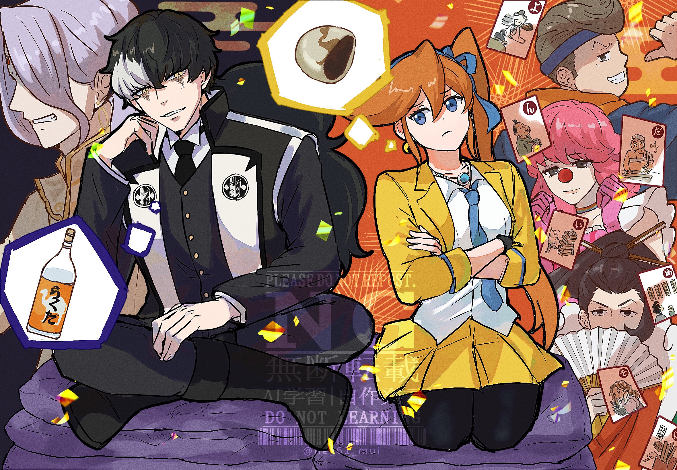 2girls 4boys ace_attorney athena_cykes black_eyes black_gloves black_hair black_jacket black_necktie black_pants black_pantyhose blue_bow blue_eyes blue_hairband blue_necktie bottle bow bow_hairband brown_eyes brown_hair bucky_whet card clown_nose collared_shirt crescent crescent_earrings cropped_jacket crossed_arms crossed_legs cup earrings geiru_toneido gloves hair_between_eyes hair_bow hairband hand_fan highres holding holding_fan jacket jewelry long_sleeves multicolored_hair multiple_boys multiple_girls nahyuta_sahdmadhi necktie nemui61 open_clothes open_jacket orange_hair pants pantyhose phoenix_wright:_ace_attorney_-_spirit_of_justice pink_gloves pink_hair pleated_skirt sakazuki sake_bottle seiza shirt simon_blackquill single_earring single_glove sitting skirt two-tone_hair uendo_toneido white_hair yellow_eyes yellow_jacket yellow_skirt