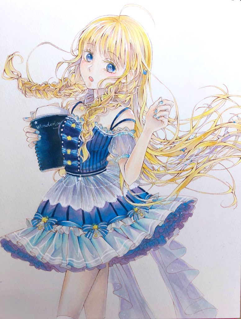 1girl :o ahoge armband blonde_hair blue_dress blue_eyes blue_nails book bow braid character_request commentary_request cowboy_shot dress dress_bow fingernails frilled_dress frills from_side hands_up holding holding_book long_hair looking_at_viewer looking_to_the_side mana_(mana0508_vy2) miracle_nikki nail_polish nikki_(series) open_mouth pleated_dress short_dress simple_background sleeveless sleeveless_dress solo twin_braids white_background