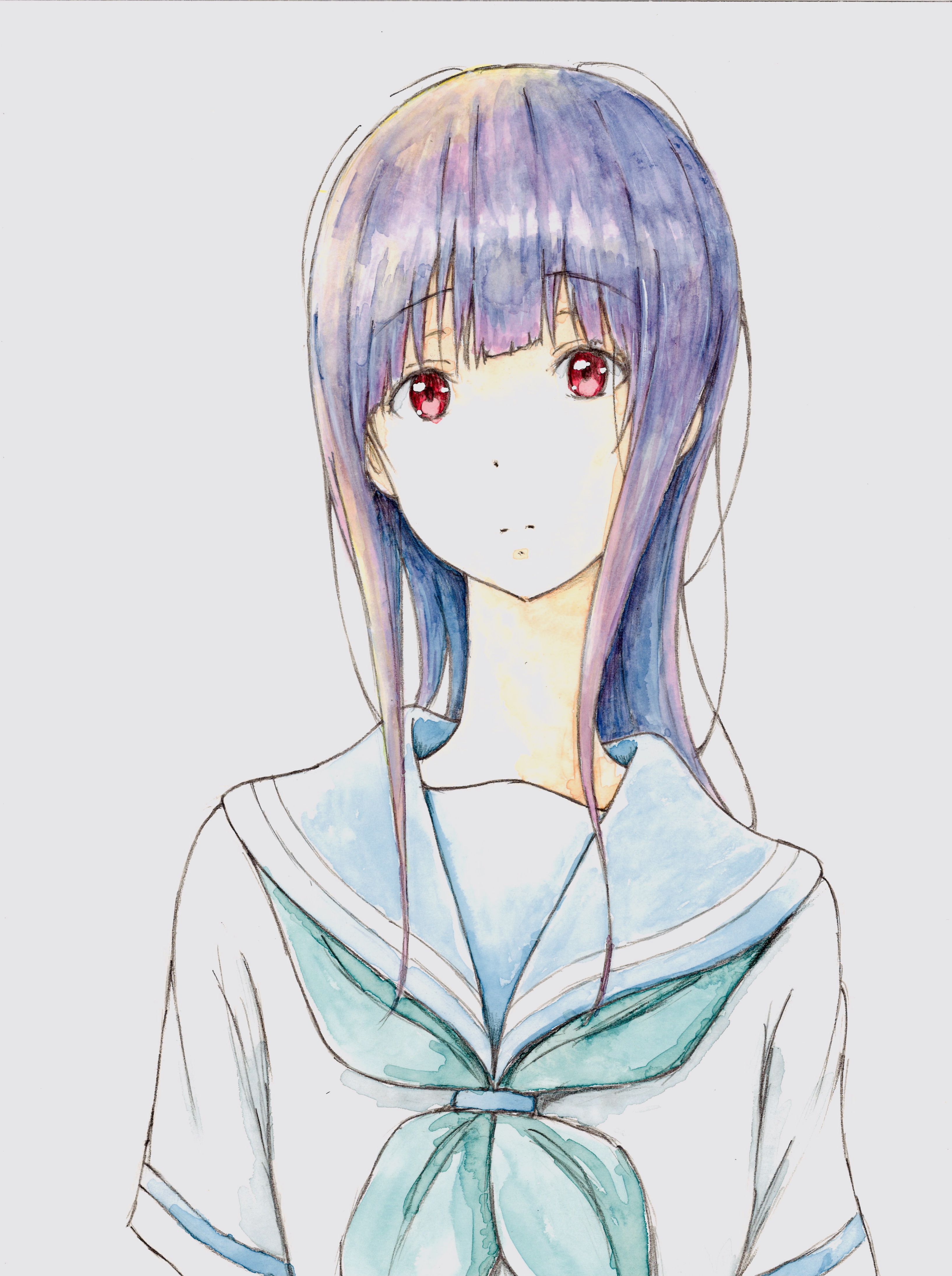 1girl absurdres bbmasa blue_hair blue_sailor_collar blunt_bangs closed_mouth commentary_request gradient_background green_neckerchief grey_background hibike!_euphonium highres kitauji_high_school_uniform liz_to_aoi_tori long_hair long_neck looking_at_viewer neckerchief red_eyes sailor_collar school_uniform shirt solo summer_uniform traditional_media white_shirt yoroizuka_mizore