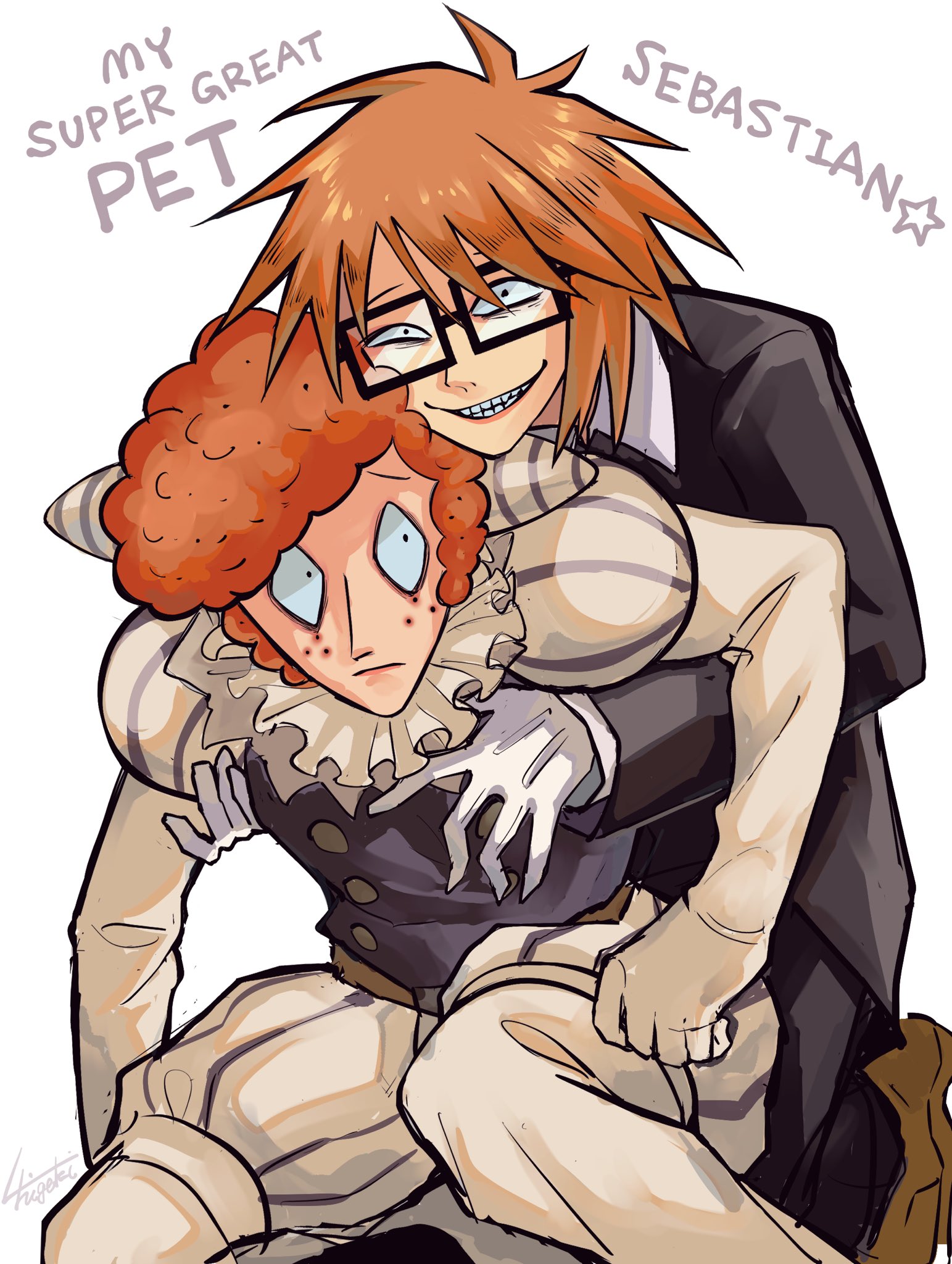 2boys :d antenna_hair artist_name bags_under_eyes behind_another black-framed_eyewear black_eyes black_jacket black_pants brown_shoes character_name closed_mouth clown collared_shirt commentary_request curly_hair english_text feet_out_of_frame freckles frown full_body glasses gloves grin head_rest highres jacket juliet_sleeves l_higeki layered_sleeves long_sleeves looking_at_another looking_at_viewer male_focus multiple_boys neck_ruff open_mouth orange_hair pants puffy_shorts puffy_sleeves purple_shorts purple_vest randal's_friends randal_ivory rectangular_eyewear sebastian_de_tomato_smith_chicken_legs shirt shoes short_hair shorts simple_background sitting smile spiked_hair star_(symbol) striped_clothes striped_shorts two-tone_shorts vertical-striped_clothes vertical-striped_shorts vest white_background white_gloves white_pants white_shirt white_shorts wide-eyed