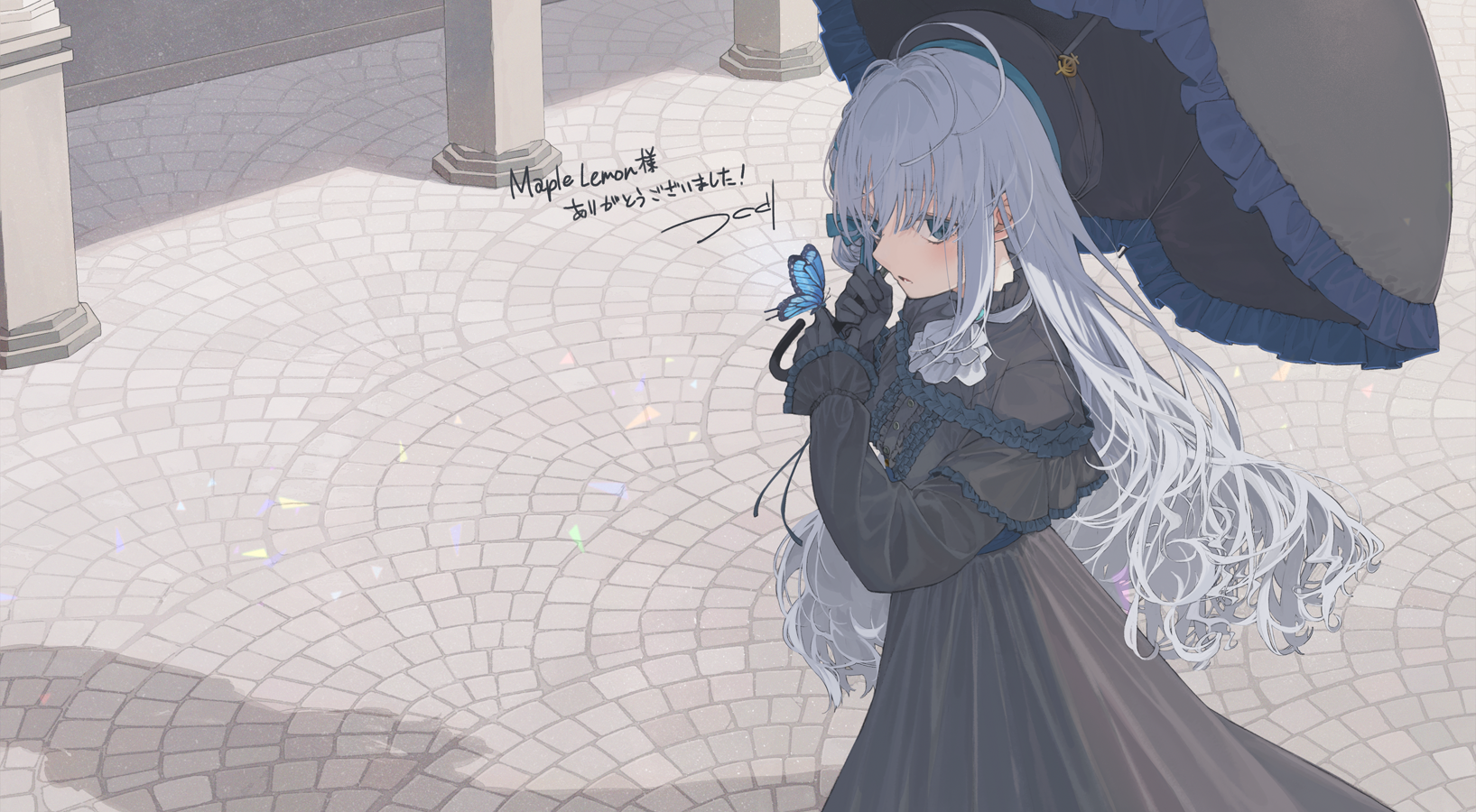 1girl ascot black_dress black_gloves black_hat blue_butterfly blue_eyes bug butterfly butterfly_on_hand commission day dress fan_paving feet_out_of_frame frilled_dress frilled_sleeves frilled_umbrella frills gloves gothic_lolita grey_hair hat highres insect lolita_fashion long_hair long_sleeves looking_at_viewer original outdoors parted_lips pavers signature skeb_commission solo standing tilted_headwear translation_request tsukugu umbrella very_long_hair white_ascot