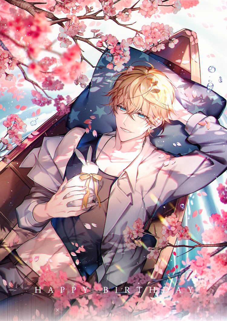 1boy animal arm_behind_head black_pants black_tank_top blonde_hair blue_eyes boat branch cherry_blossoms chinese_commentary closed_mouth clothes_lift collarbone cowboy_shot crossed_bangs dappled_sunlight earrings flower hair_between_eyes happy_birthday holding holding_animal jacket jewelry long_sleeves looking_at_viewer love_and_producer lying male_focus midriff necklace off_shoulder on_back on_boat open_clothes open_jacket pants parted_lips petal_on_body petals pillow pink_flower rabbit ribbon ring ring_necklace s_(olath) shirt_lift short_hair solo stud_earrings sunlight tank_top water water_drop watercraft white_jacket wing_collar yellow_ribbon zhou_quiluo