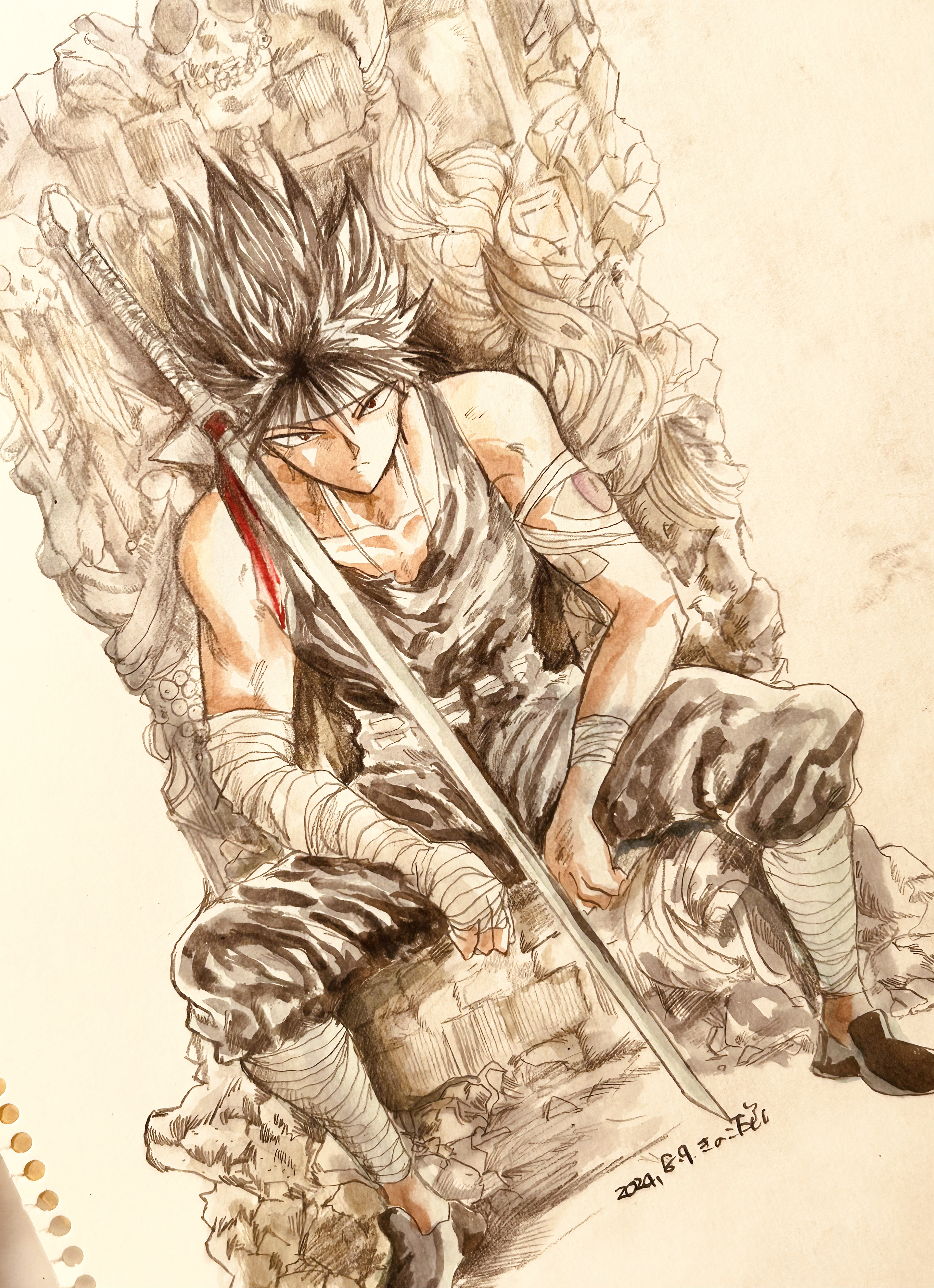 1boy absurdres bandaged_arm bandages black_hair headband hiei4455 hiei_(yu_yu_hakusho) highres male_focus photo_(medium) shirt sitting sleeveless sleeveless_shirt solo spiked_hair sword tank_top throne traditional_media weapon white_headband yuu_yuu_hakusho