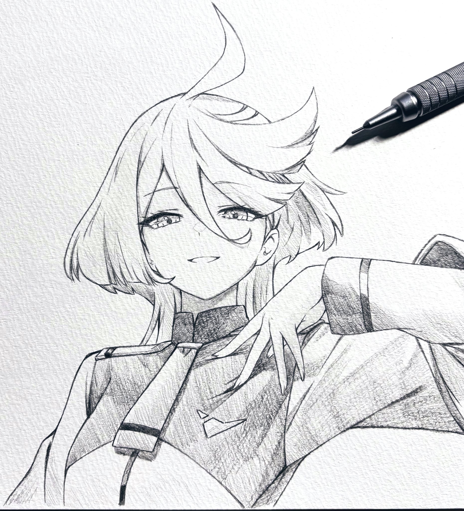 1girl ahoge art_tools_in_frame graphite_(medium) greyscale gundam gundam_suisei_no_majo hair_between_eyes highres jacket looking_at_viewer medium_hair miorine_rembran monochrome necktie photo_(medium) seishun_dendeke simple_background smile solo traditional_media upper_body white_background
