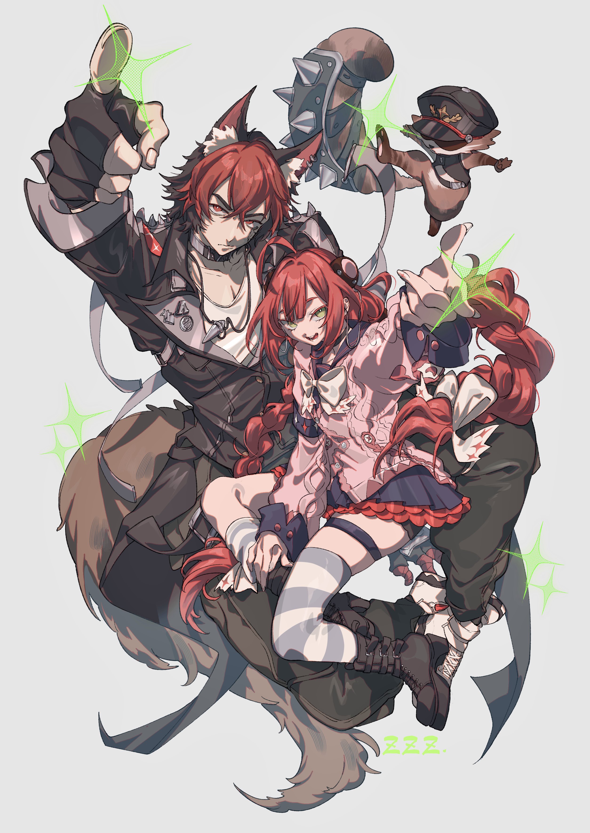 1boy 1girl absurdres animal animal_ear_fluff animal_ear_piercing animal_ears arm_up bandaged_arm bandages black_boots black_gloves black_hair black_hat black_jacket black_sailor_collar boots braid braided_twintails cardigan chest_bow closed_mouth collar collarbone commentary crossed_bangs dog_boy dog_ears dog_tail fingerless_gloves full_body gloves green_eyes grey_background hair_between_eyes hair_ornament hair_ribbon hat hearing_aid highres jacket jewelry kamanosuke_(zenless_zone_zero) komano_manato long_hair looking_at_viewer multicolored_hair muscular muscular_male necklace open_mouth pectorals pink_cardigan pointing raccoon red_bandage red_hair ribbon sailor_collar scar scar_across_eye scar_on_face shirt shoes short_hair sneakers sparkle sphere_hair_ornament spiked_jacket untranslatable_commentary tail tanuki ukinami_yuzuha v-shaped_eyebrows white_shirt white_shoes yamazaki_tsukune zenless_zone_zero
