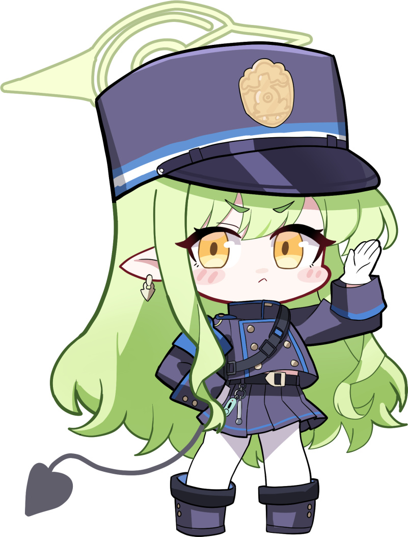 black_hat blue_archive blush chibi gloves green_hair green_halo halo hashtag-only_commentary hat hideinroom long_hair looking_at_viewer pantyhose pointy_ears simple_background skirt standing tail white_background white_gloves white_pantyhose yellow_eyes