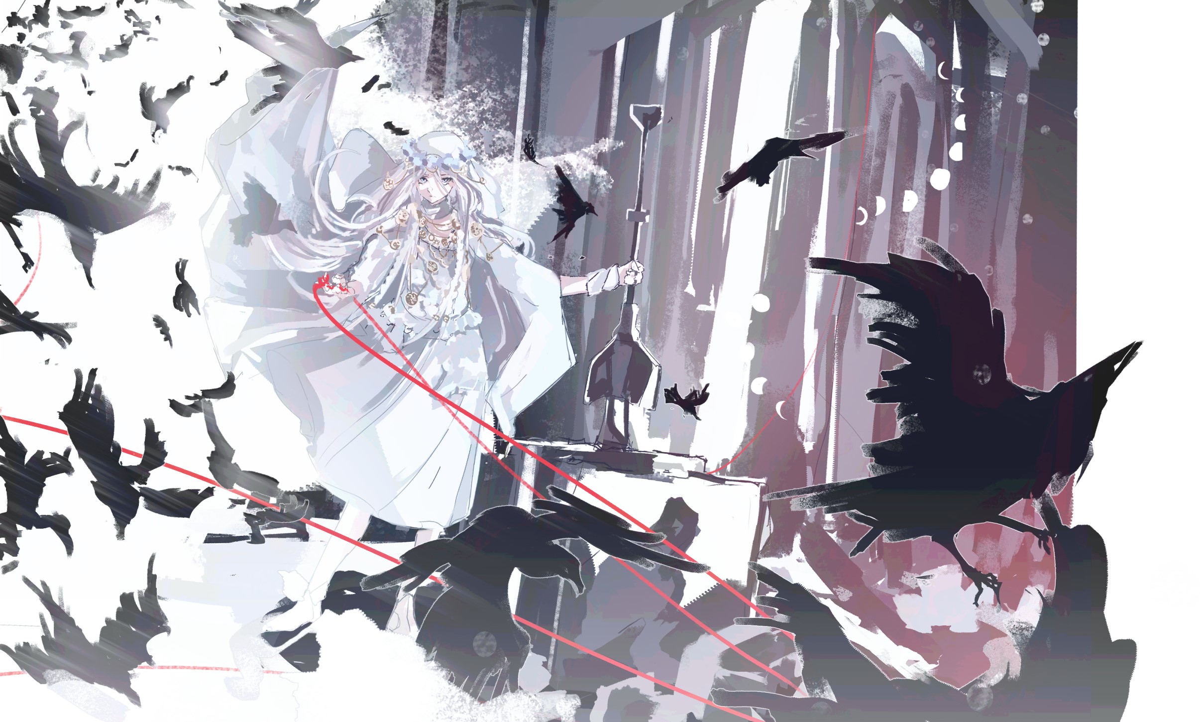 1girl bird commentary crow dress elden_ring elden_ring_nightreign english_commentary flower_wreath full_body hair_between_eyes highres holding holding_shovel long_hair long_hair_between_eyes rebecca59118221 revenant_(elden_ring) shovel solo string string_of_fate very_long_hair white_dress white_hair
