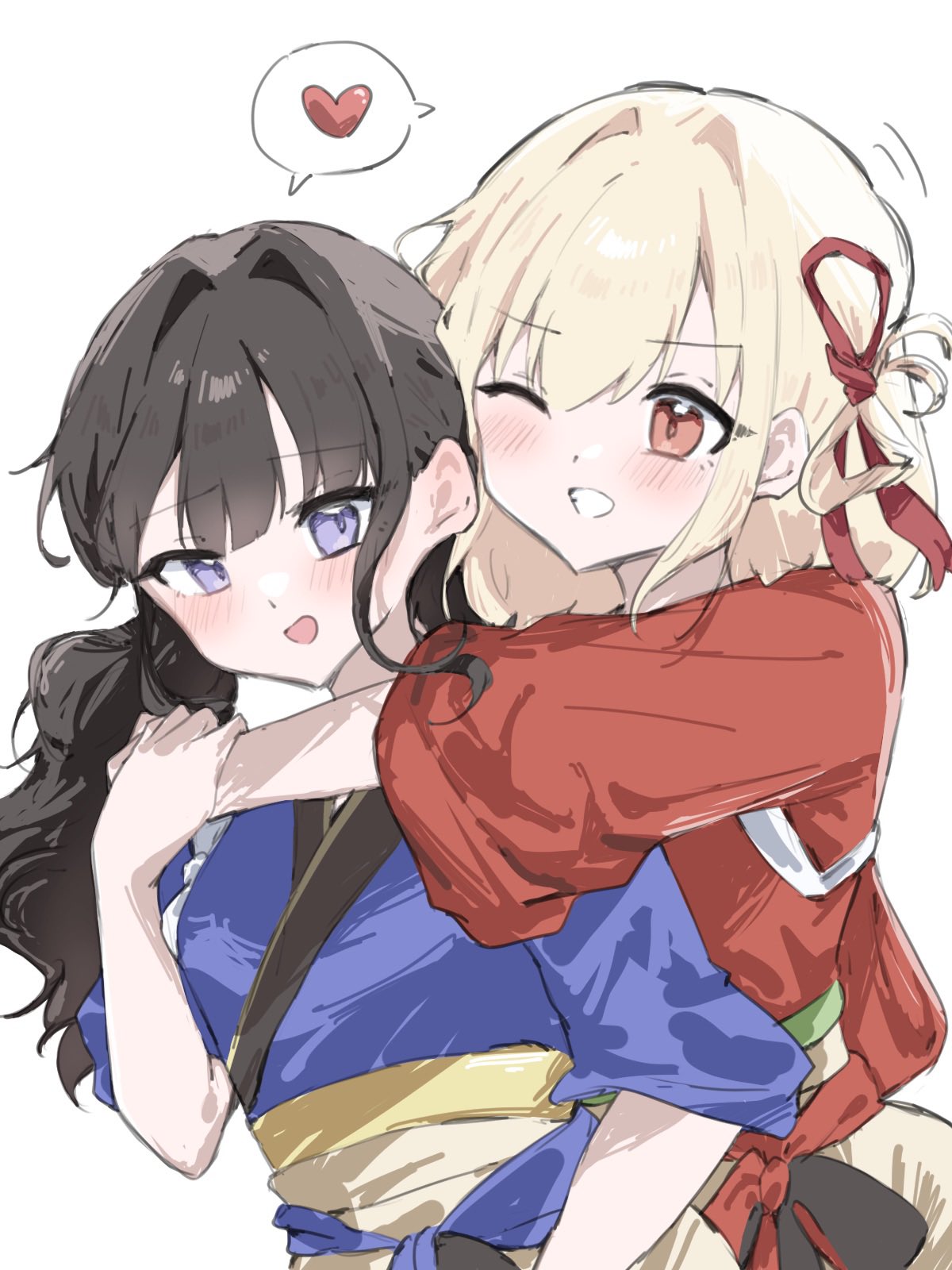 2girls black_hair blonde_hair blue_kimono blush commentary hair_ribbon heart highres inoue_takina japanese_clothes kimono long_hair lycoris_recoil medium_hair mesugakisaikou multiple_girls nishikigi_chisato one_eye_closed one_side_up purple_eyes red_eyes red_kimono red_ribbon ribbon shared_speech_bubble simple_background speech_bubble spoken_heart twintails white_background