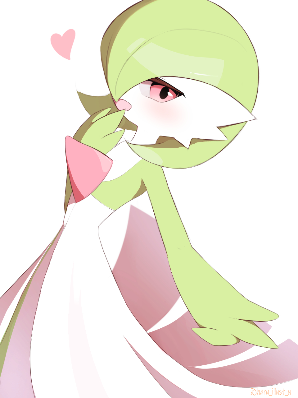 1girl artist_name blush bob_cut colored_skin dutch_angle female_focus flat_chest gardevoir gen_3_pokemon green_hair green_skin hair_over_one_eye half-closed_eyes hand_to_own_mouth hand_up happy harutorii heart highres looking_at_viewer multicolored_skin nintendo one_eye_covered open_mouth outstretched_arm pokemon pokemon_(creature) red_eyes short_hair signature simple_background smile solo standing twitter_username two-tone_skin white_background white_skin