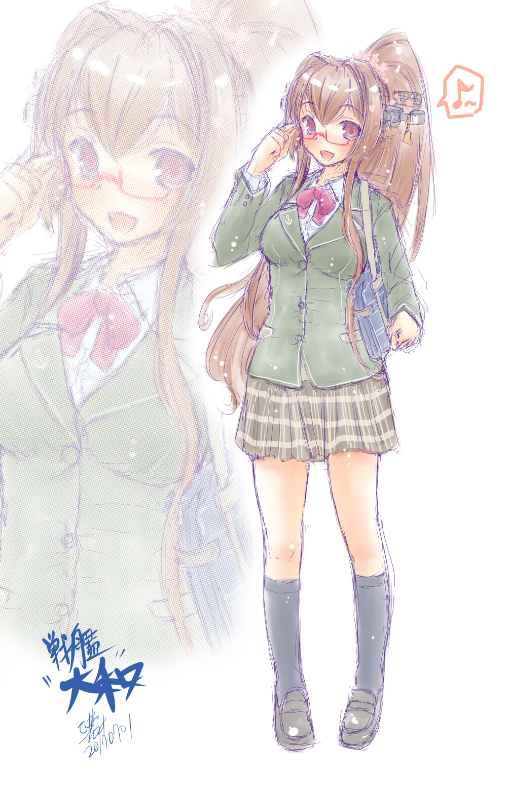 1girl alternate_costume bag bespectacled black_hair black_socks blazer bow bowtie brown_eyes brown_skirt eighth_note full_body glasses green_jacket headgear highres jacket kantai_collection koshigaya_tatsumi long_hair multiple_views musical_note plaid_clothes plaid_skirt pleated_skirt red_bow red_bowtie school_bag skirt socks solo spoken_musical_note standing yamato_(kancolle) zoom_layer