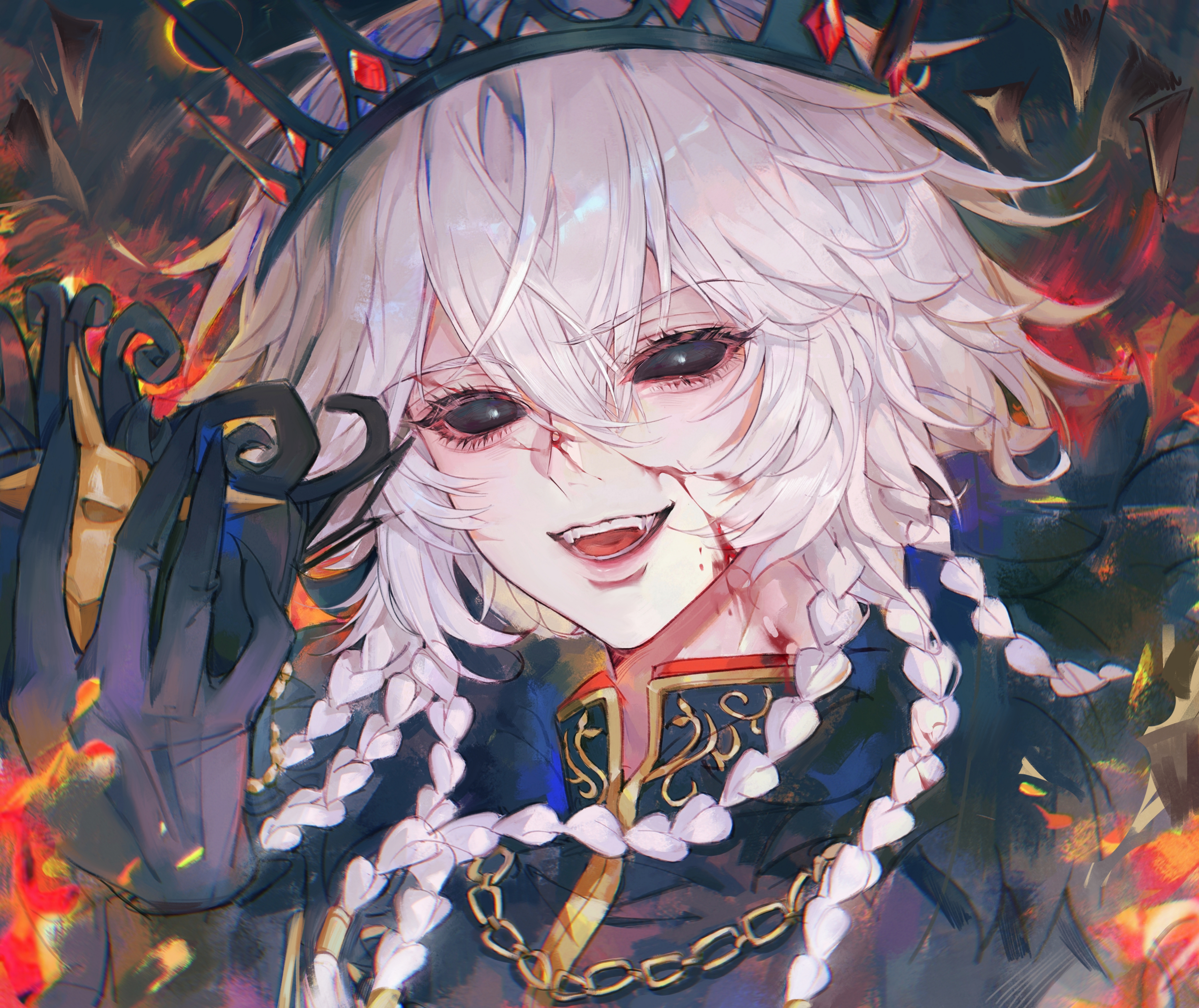1boy absurdres androgynous bishounen black_crown black_gloves black_sclera blood blood_on_clothes blood_on_face braid claws colored_sclera crossed_bangs crown evil_smile eyelashes gloves gold_trim helmet high_collar highres holding holding_unworn_helmet identity_v ithaqua_(identity_v) ithaqua_(morningstar)_(identity_v) looking_at_viewer male_focus multiple_braids no_mask official_alternate_costume portrait smile solid_eyes solo unworn_headwear unworn_helmet white_hair xiaomianduoshao