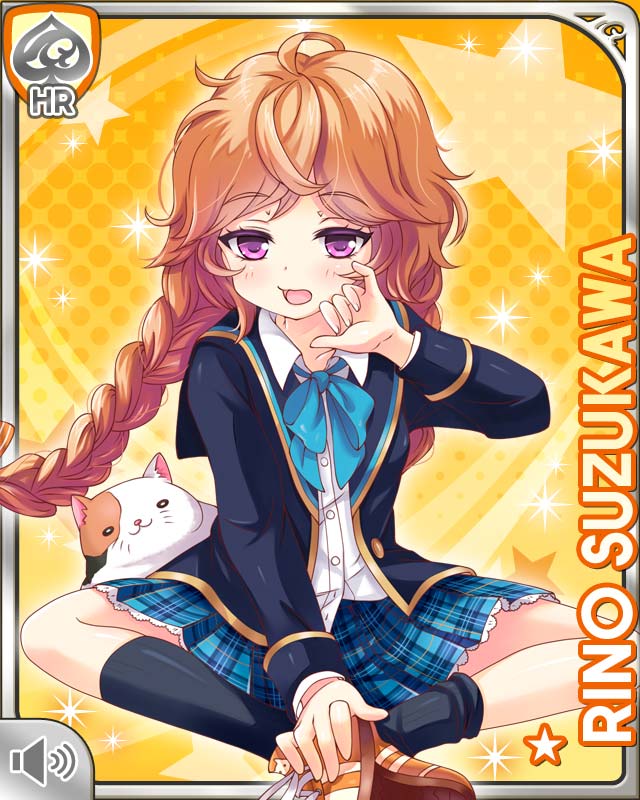 1girl ahoge bow braid brown_hair card_(medium) cat character_name collarbone day girlfriend_(kari) green_bow hair_ribbon official_art open_mouth outdoors plaid_clothes plaid_skirt pleated_skirt polka_dot polka_dot_bow purple_eyes qp:flapper ribbon school_uniform shoes sitting skirt socks solo suzukawa_rino twin_braids yawning yellow_background