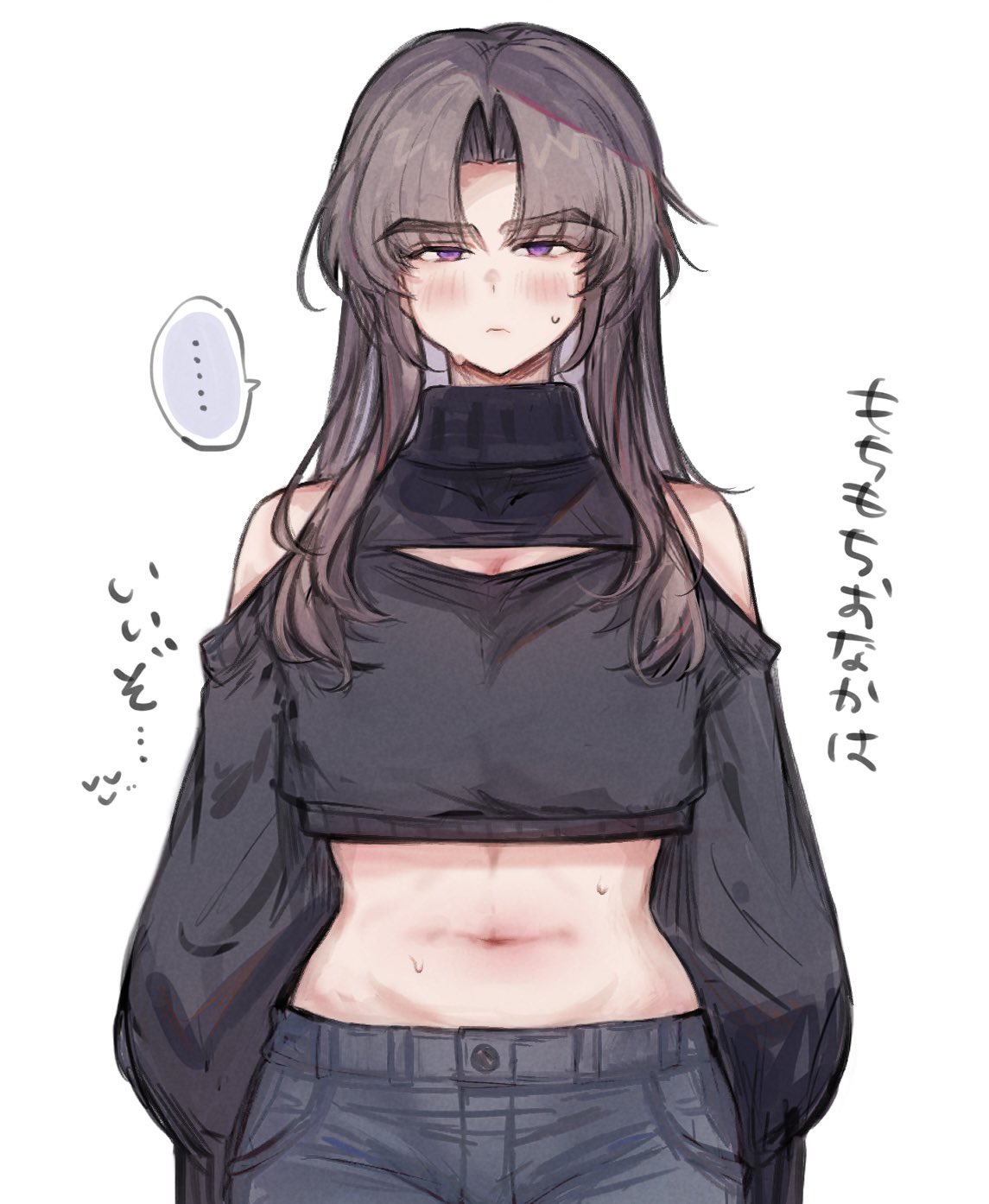 ... 1boy ayase_ayato_(imamiya_pinoko) bare_shoulders blue_pants blush brown_hair closed_mouth crop_top crossdressing crossdressing_(mtf) denim highres imamiya_pinoko jeans long_hair looking_at_viewer male_focus navel original pants parted_bangs purple_eyes simple_background solo speech_bubble spoken_ellipsis sweat thick_eyebrows translation_request trap white_background