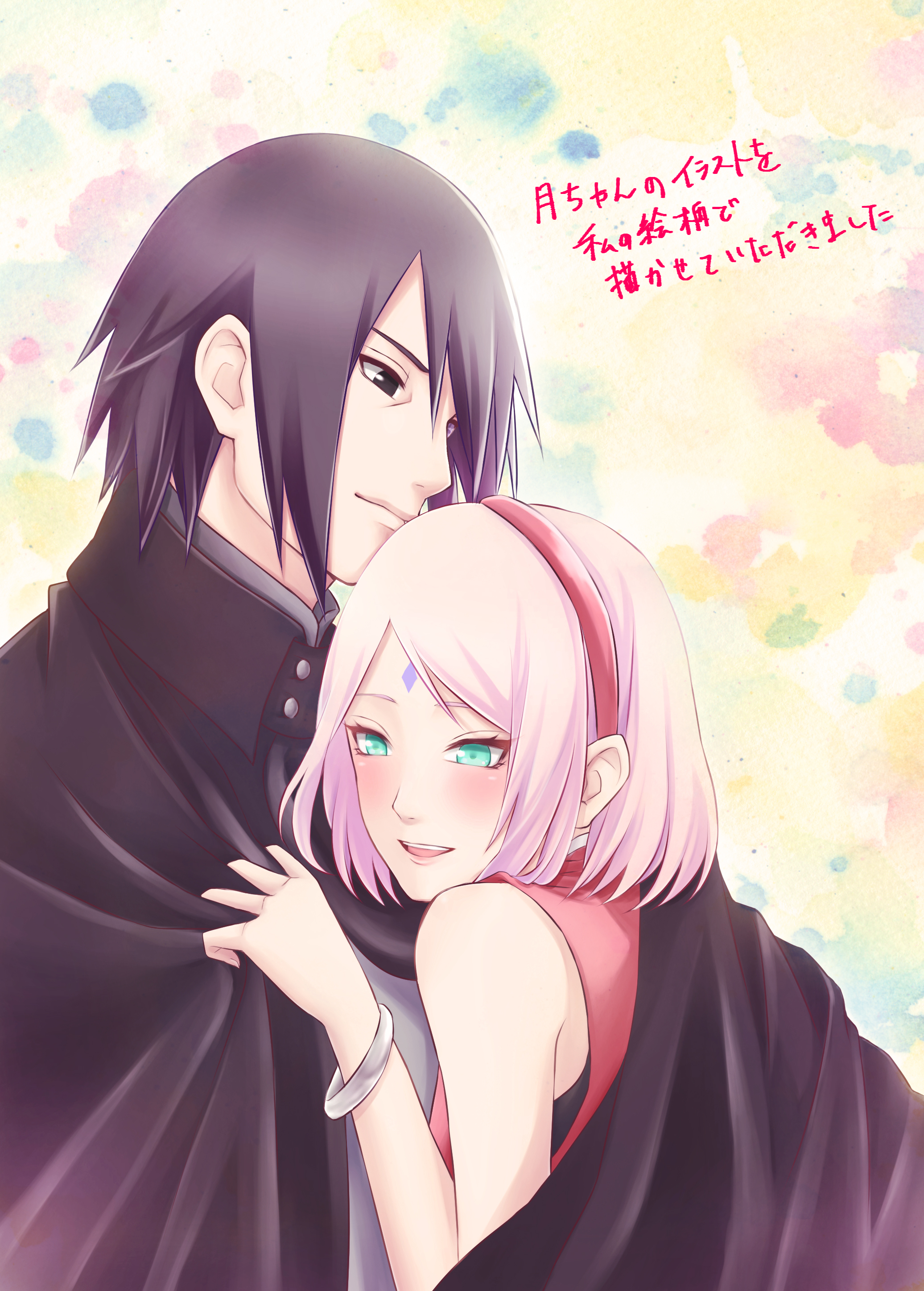 1boy 1girl :d absurdres black_cloak black_eyes black_hair blush boruto:_naruto_next_generations cloak closed_mouth couple dress facial_mark forehead_mark green_eyes hairband haruno_sakura hetero highres hug husband_and_wife mochiii-s naruto_(series) open_mouth pink_hair purple_eyes red_dress red_hairband rinnegan short_hair sleeveless sleeveless_dress smile translation_request uchiha_sasuke upper_body