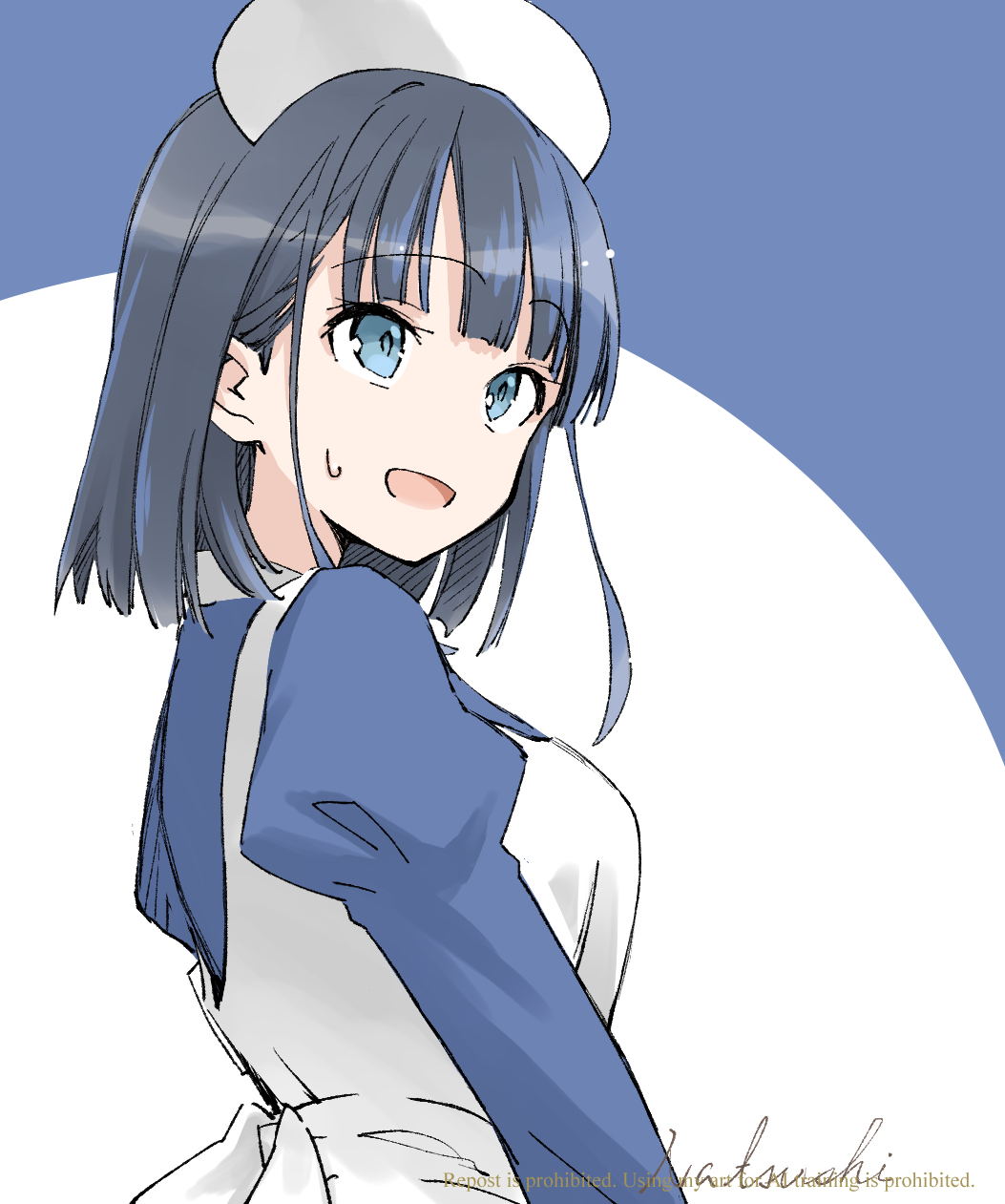 1girl akagi_ikumi apron artist_name black_hair blue_background blue_dress blue_eyes blush breasts collared_dress dress hat highres juliet_sleeves long_sleeves looking_at_viewer medium_breasts natsushi nurse_cap open_mouth puffy_sleeves seishun_buta_yarou short_hair upper_body white_apron