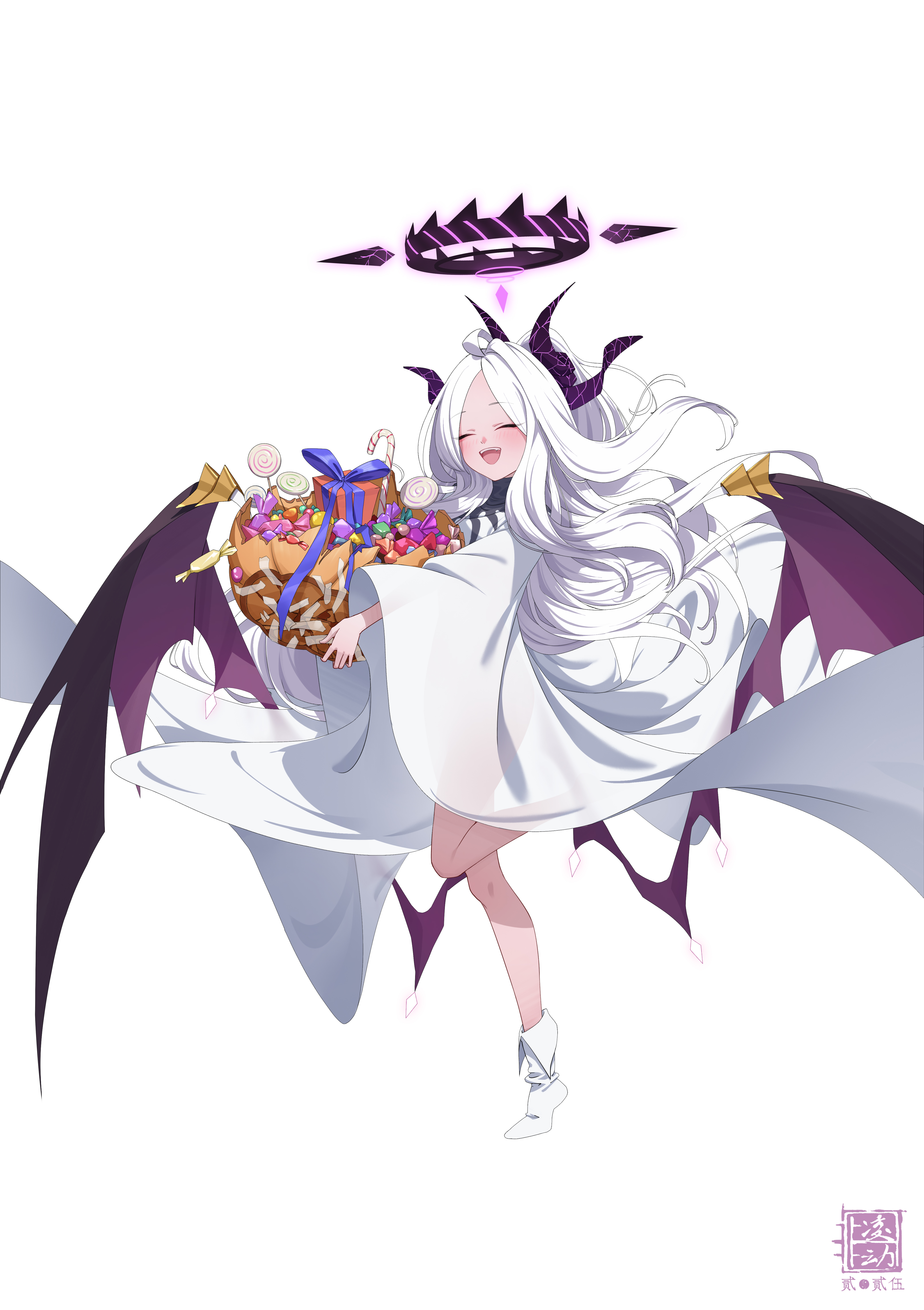 1girl absurdres ahoge black_halo blue_archive breasts demon_girl demon_horns demon_wings feilingdong halloween halo highres hina_(blue_archive) hina_(dress)_(blue_archive) horns long_hair low_wings open_mouth pumpkin simple_background small_breasts smile solo standing tachi-e very_long_hair white_background white_hair wings