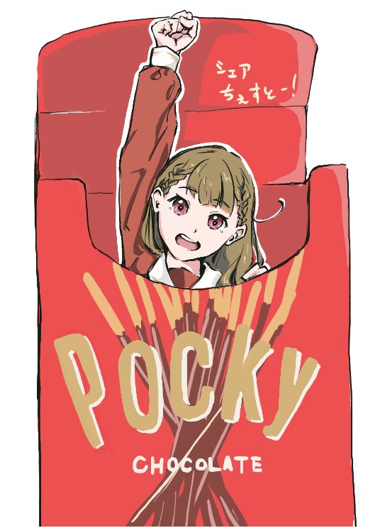 1girl :d braid brown_hair center-flap_bangs chesto_(phrase) commentary food hasu_no_sora_school_uniform kachimachi_kosuzu link!_like!_love_live! long_sleeves looking_at_viewer love_live! mame_orca open_mouth pink_eyes pocky raised_fist sailor_collar school_uniform side_ahoge side_braids smile solo virtual_youtuber white_sailor_collar winter_uniform