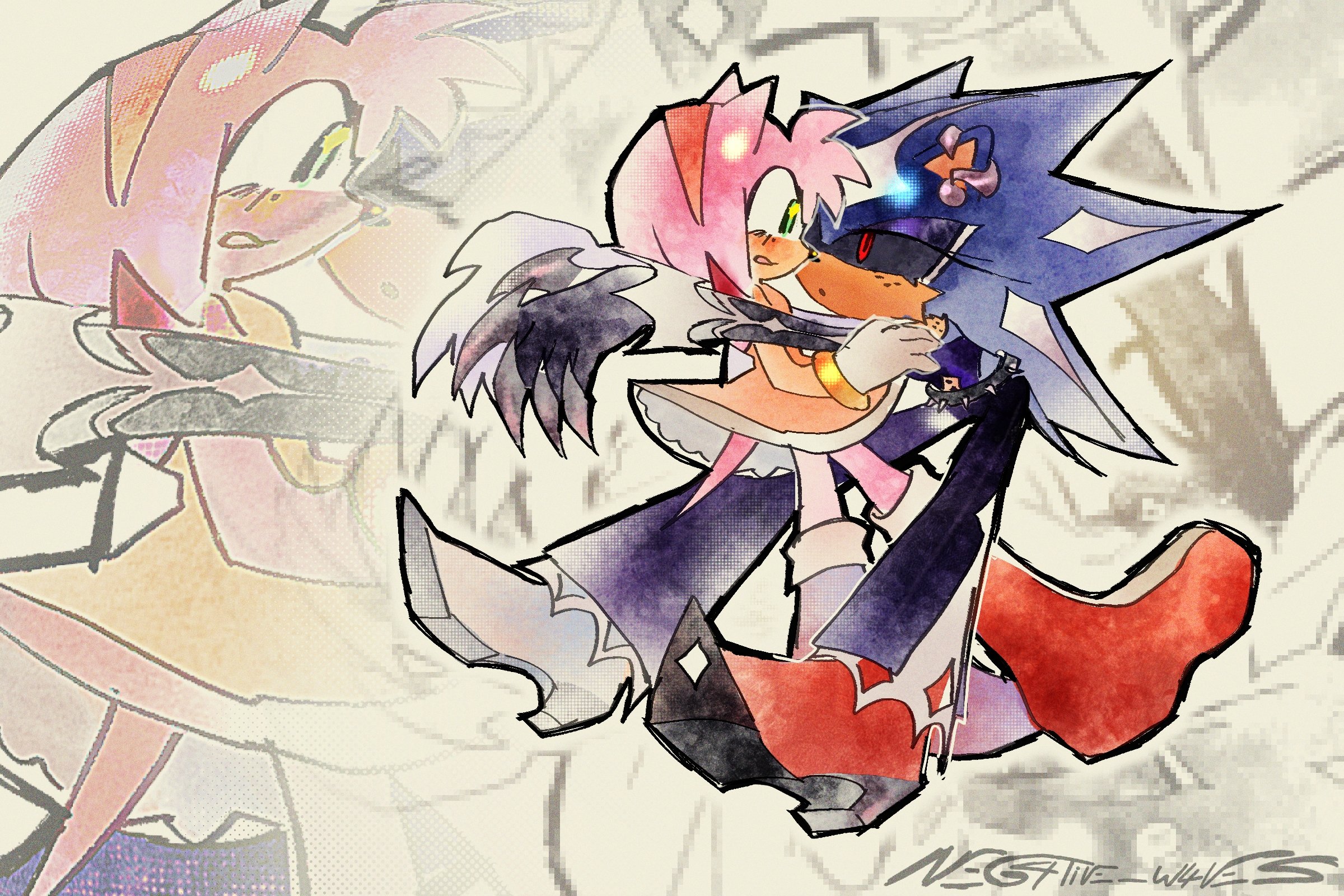 2girls alternate_form amy_rose arms_around_neck black_sclera blush colored_sclera furry furry_female green_eyes headband hedgehog_girl highres metal_sonic multiple_girls neg4tive_w4ves neo_metal_sonic pink_fur red_eyes red_headband robot sonic_(series) surprised yuri